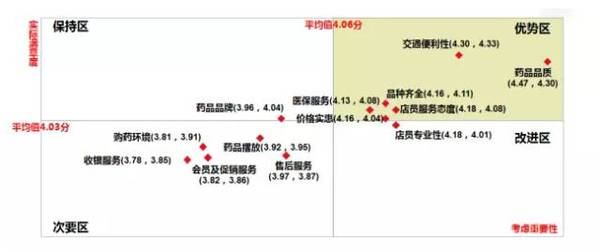 那么,消费者在药店购药过程会考虑哪些因素?他们的满意程度如何?从下图可看出,药品品质和位置交通便利性是消费者选择药店的首要考虑因素,其满意度也较高。值得关注的是,店员专业性一直处于改进区,针对这一方面的改进与提升可以说是药店未来的机会点。