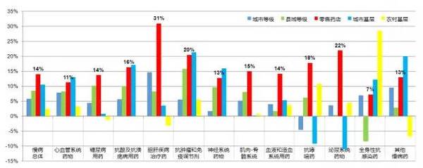 随着分级诊疗模式的推进,慢病看护下放到基层成为趋势。数据显示,慢病各品类2015年在零售药店的增长率明显高于其他渠道。(如下图所示)