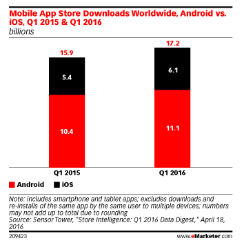 eMarketer认为,全球的智能手机和平板电脑的用户在截止2015年的12个月里增长了16%,而在2016年一季度的移动应用下载量同比增长了8%。由此可见,尽管移动应用市场的竞争日益积累,仍有大量机遇和空间存在。