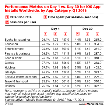 研究还发现,移动应用的用户忠诚度在逐年下降。Localytics发现30日留存率从2015年6月的42%下降至2016年6月的37%。另外,80%的新用户会在3个月后停止使用一款APP,而这一比例在2015年为75%。