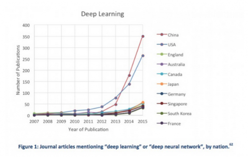 以上图表是奥巴马政府于周三(12日)发布的一项意在刺激美国AI研发的新战略计划的一部分。这个图表让人震惊的是,尽管美国在深度学习研究上的起步最早,但中国在AI主题上的论文发表数量已超过美国,并且两国的增长率差距明显,这反映了中国研究重点转变之迅速。