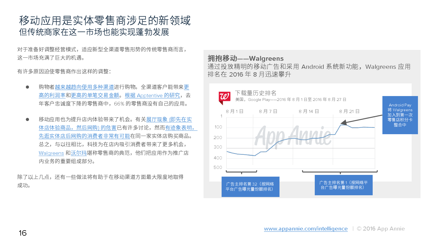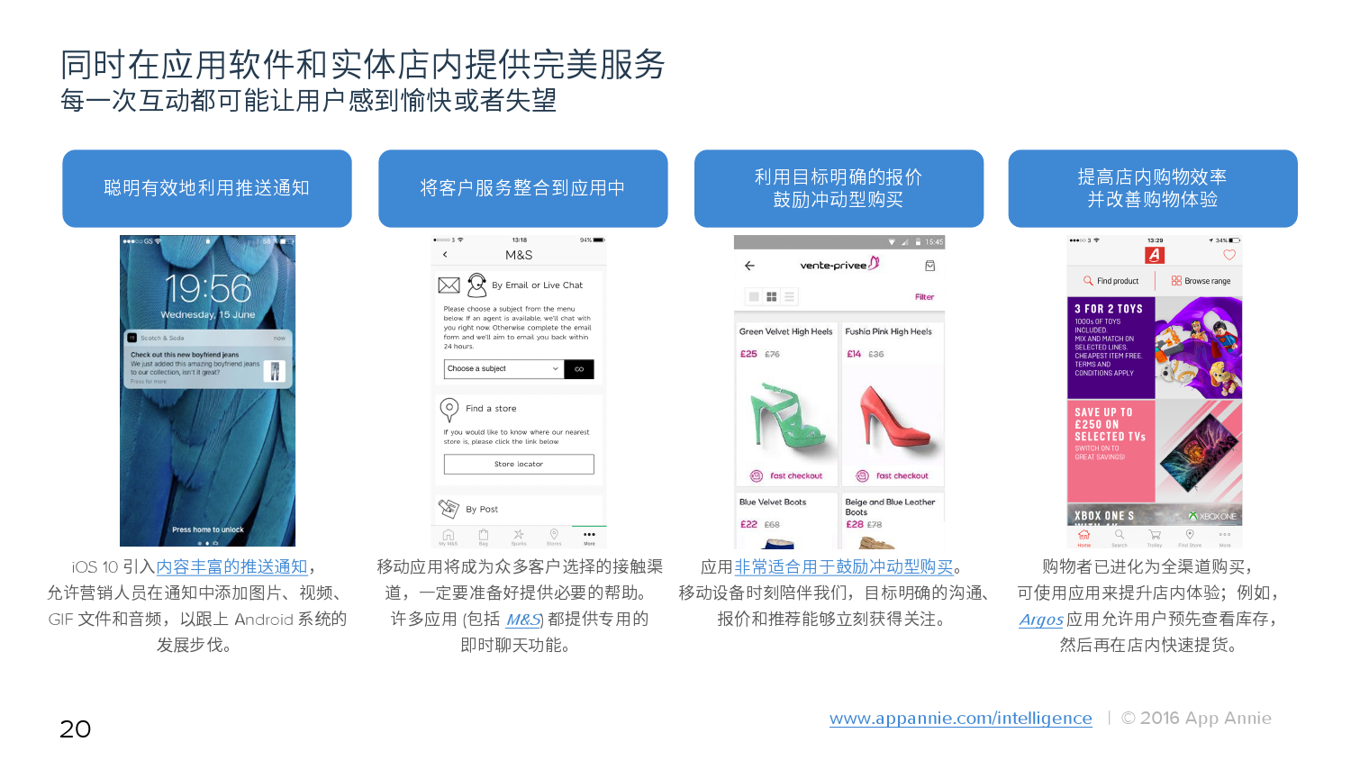 一些精明的零售商开始使用复杂的移动技术,通过移动应用吸引消费者。顾客进店时,会使用移动信标(beacon)推送包含特惠信息的通知。店面布局也加入到了应用中,以精确定位特定商品,同时支持多种移动支付选择,如 Android Pay 和 Apple Pay,使结算变得轻松简单。