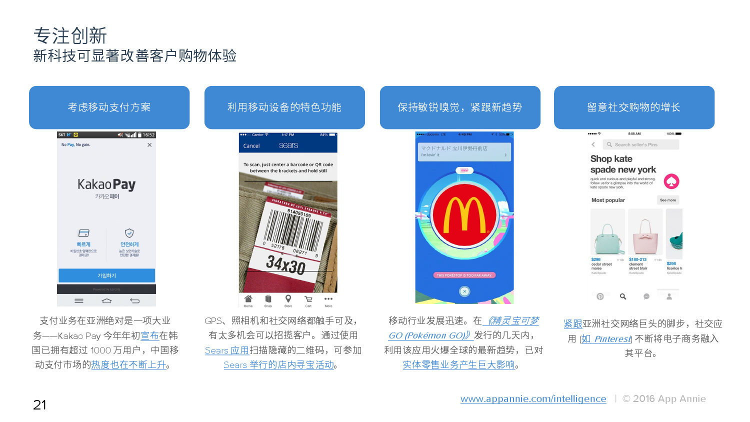 移动设备颠覆了零售商的业务模式,改变了消费者了解和购买商品的方式,并为零售品牌联系消费者提供了新的途径。一些领先的零售商开始采用全渠道销售结合移动应用的方式,来满足消费者的需求和期望。