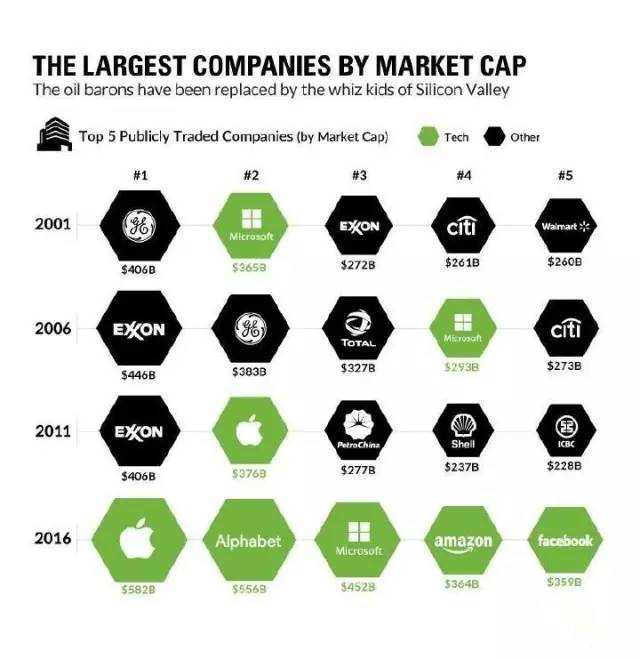10年前在PC如日中天的时代,微软是唯一一家市值挤进全球前20的科技公司。5年前,按市值排名的五大公司中有五家从事石油行业:埃克森、中国石油和荷兰皇家壳牌,这依然是工业经济时代的代表,能源企业占据优势。随着能源行业没落,五家最大的科技公司创造的数字平台渗透到人们生活工作的方方面面——从智能手机到云计算平台,再到手机聊天应用。互联网科技公司已然成为世界经济中的新领导者。