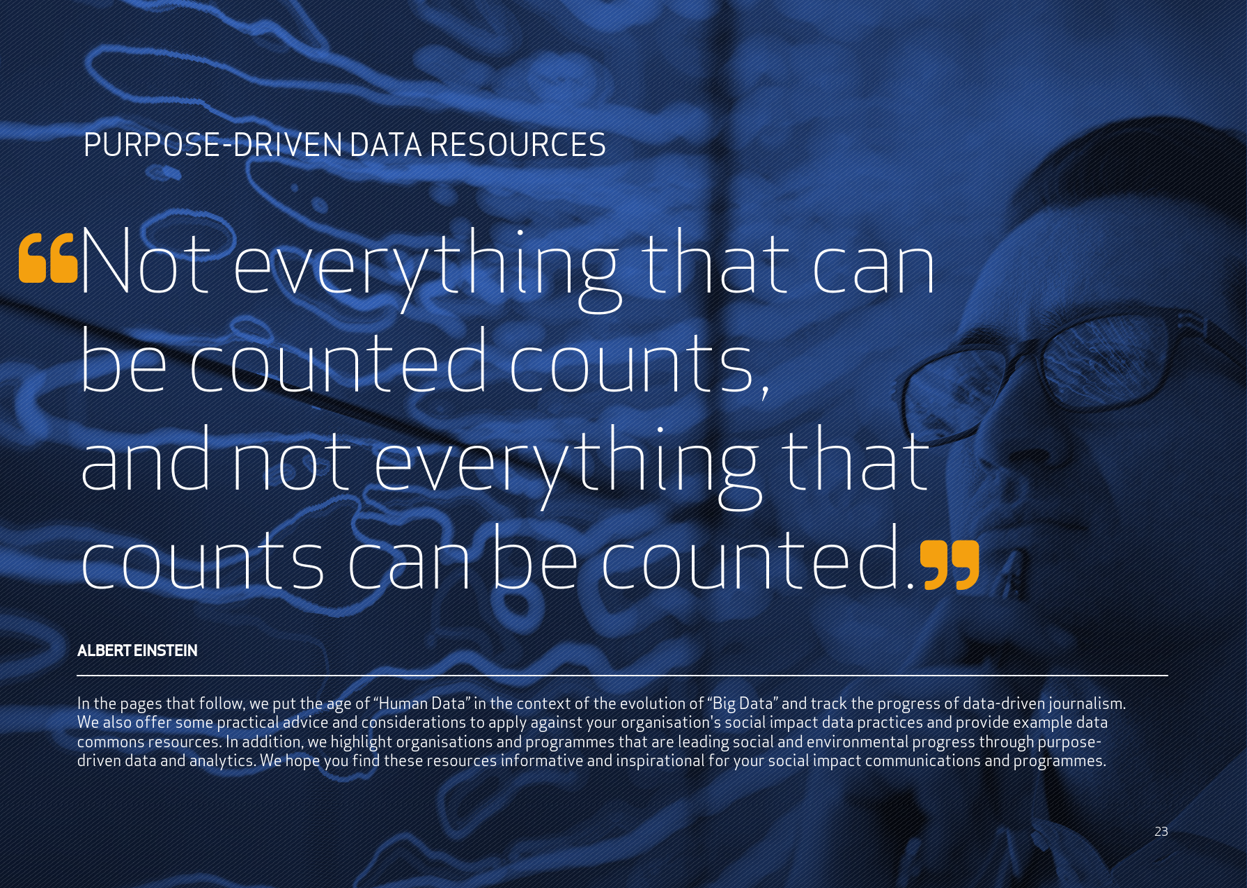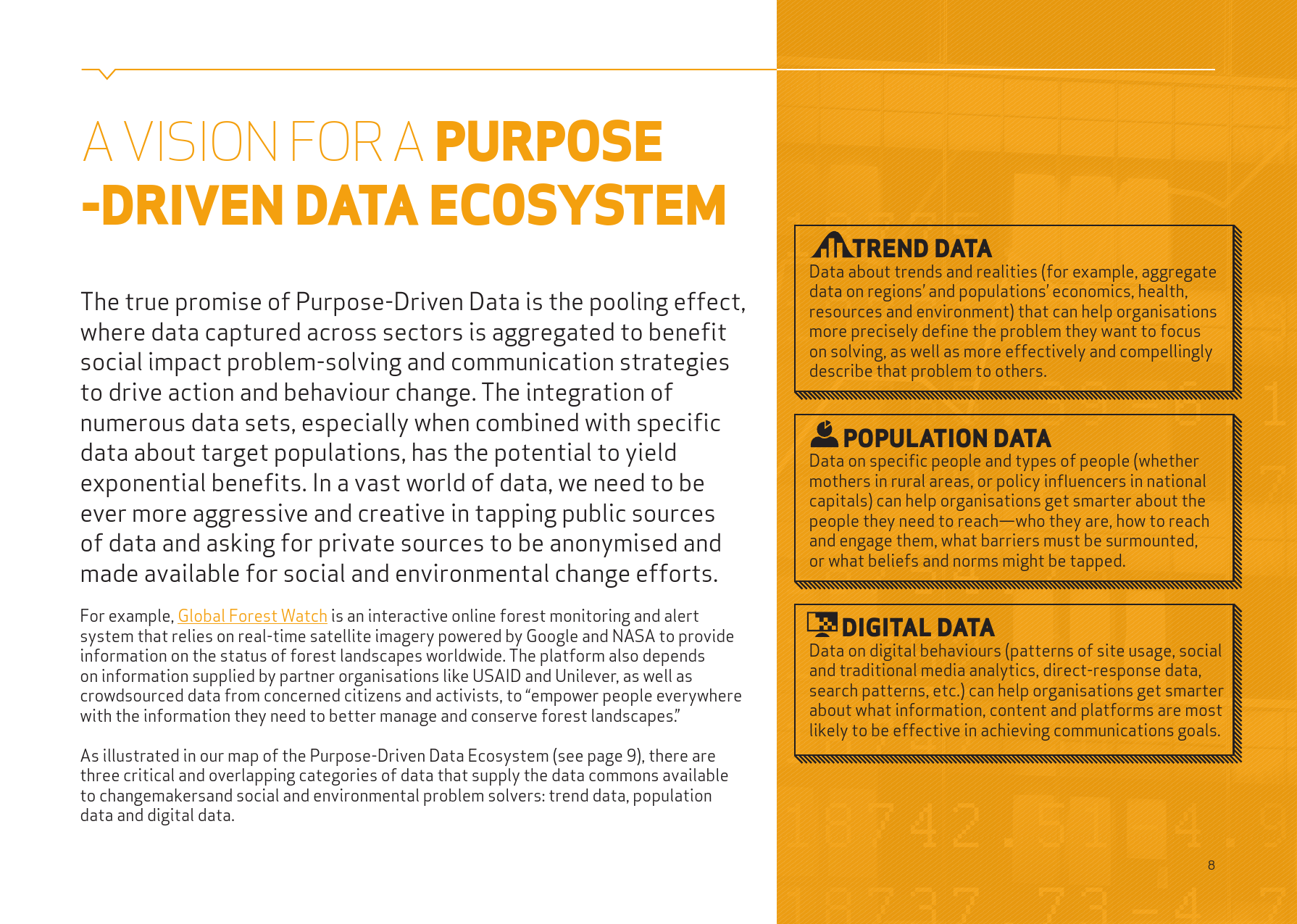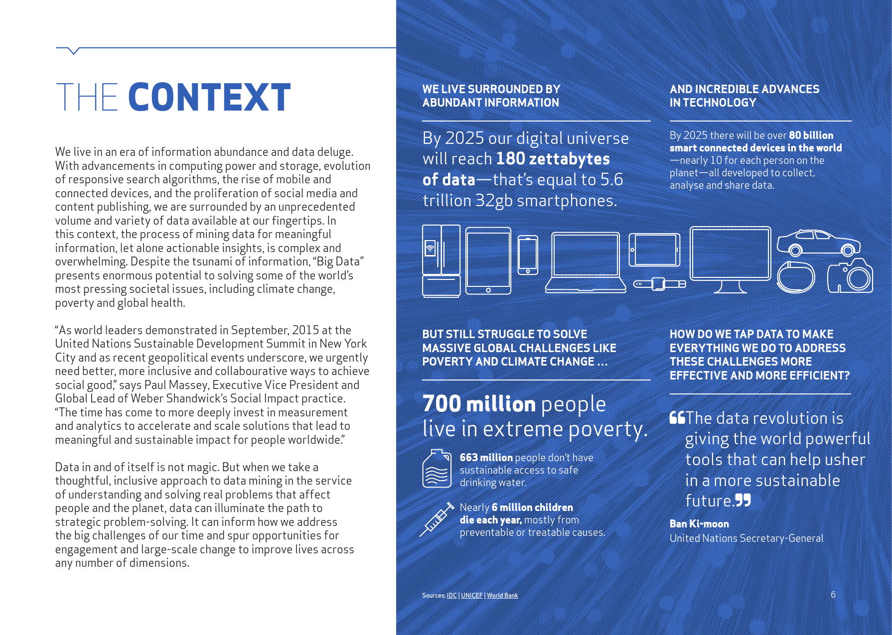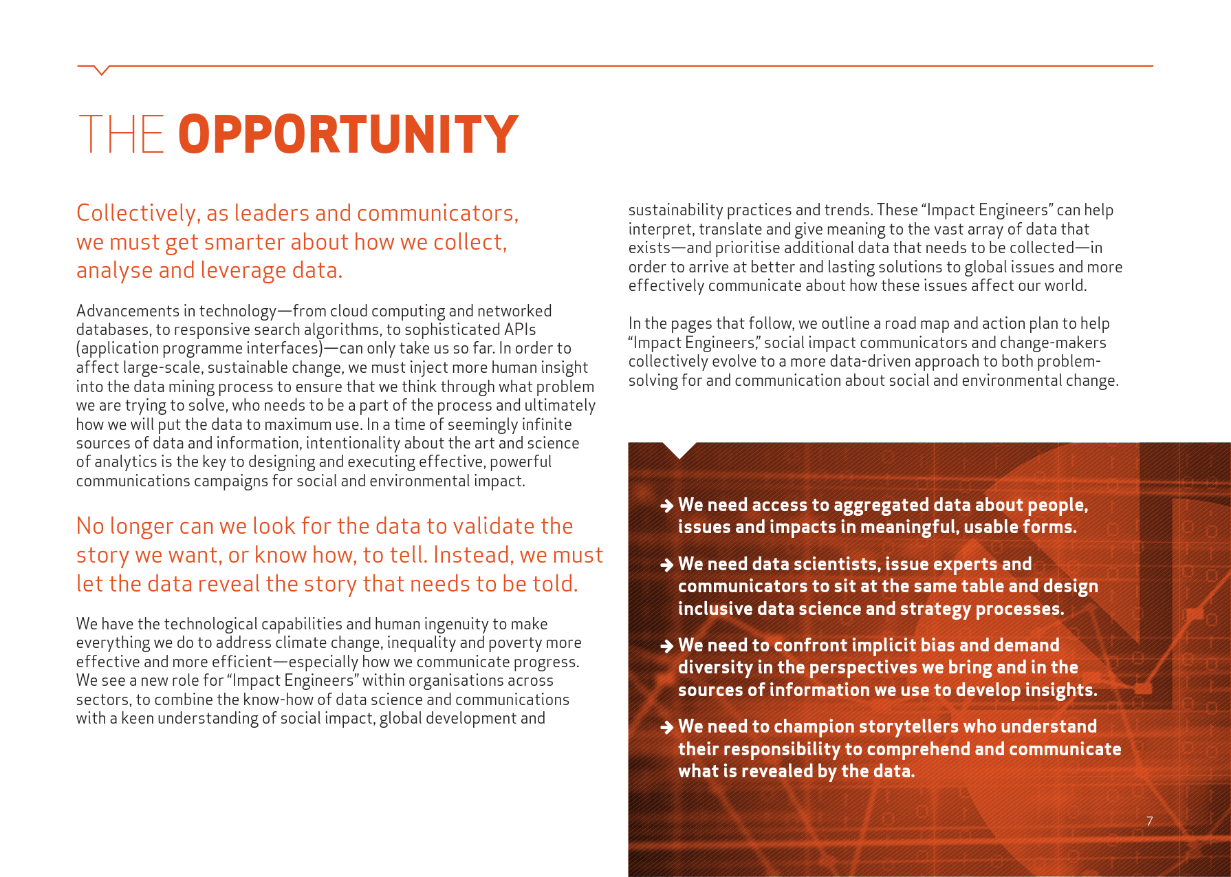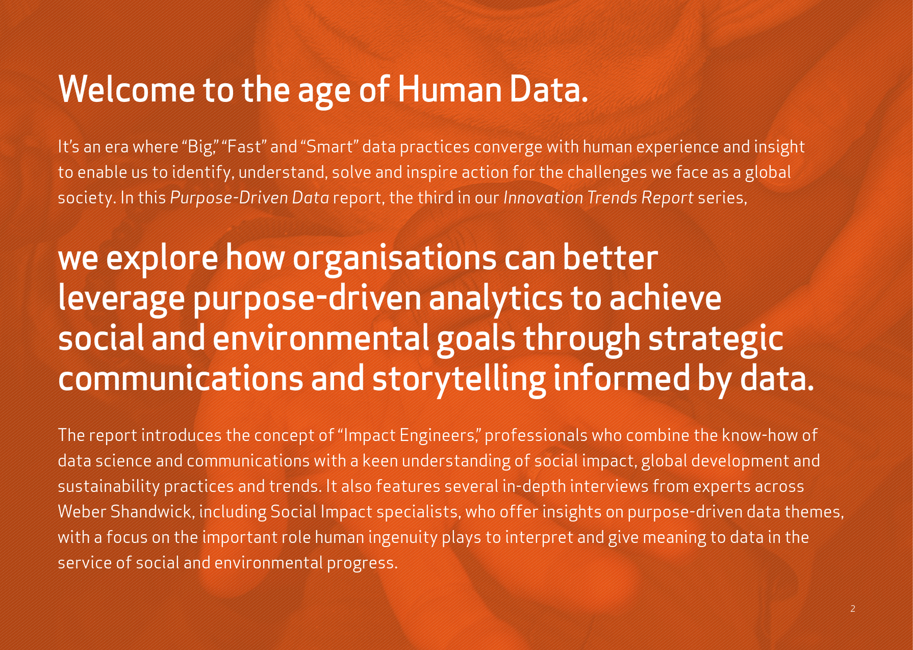 《目标驱动的数据》报告提出了“影响工程师”的概念,这些专业人士能够深入理解企业社会责任影响、国际发展与可持续性实践和趋势,能够将数据科学知识与传播有机结合在一起。该报告还展示了对万博宣伟若干专家进行的深度采访,其中包括一些企业社会责任专家,他们介绍了关于目标驱动数据相关话题的观点,同时强调了人类独创性对解读和赋予数据意义用以服务推动社会化以及环境发展进程所起的重要作用。