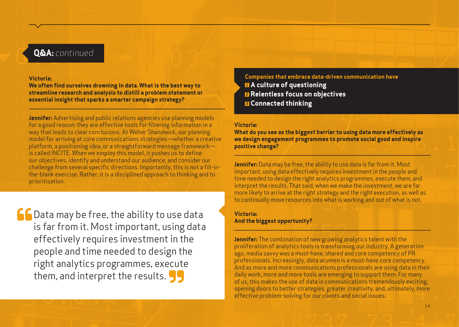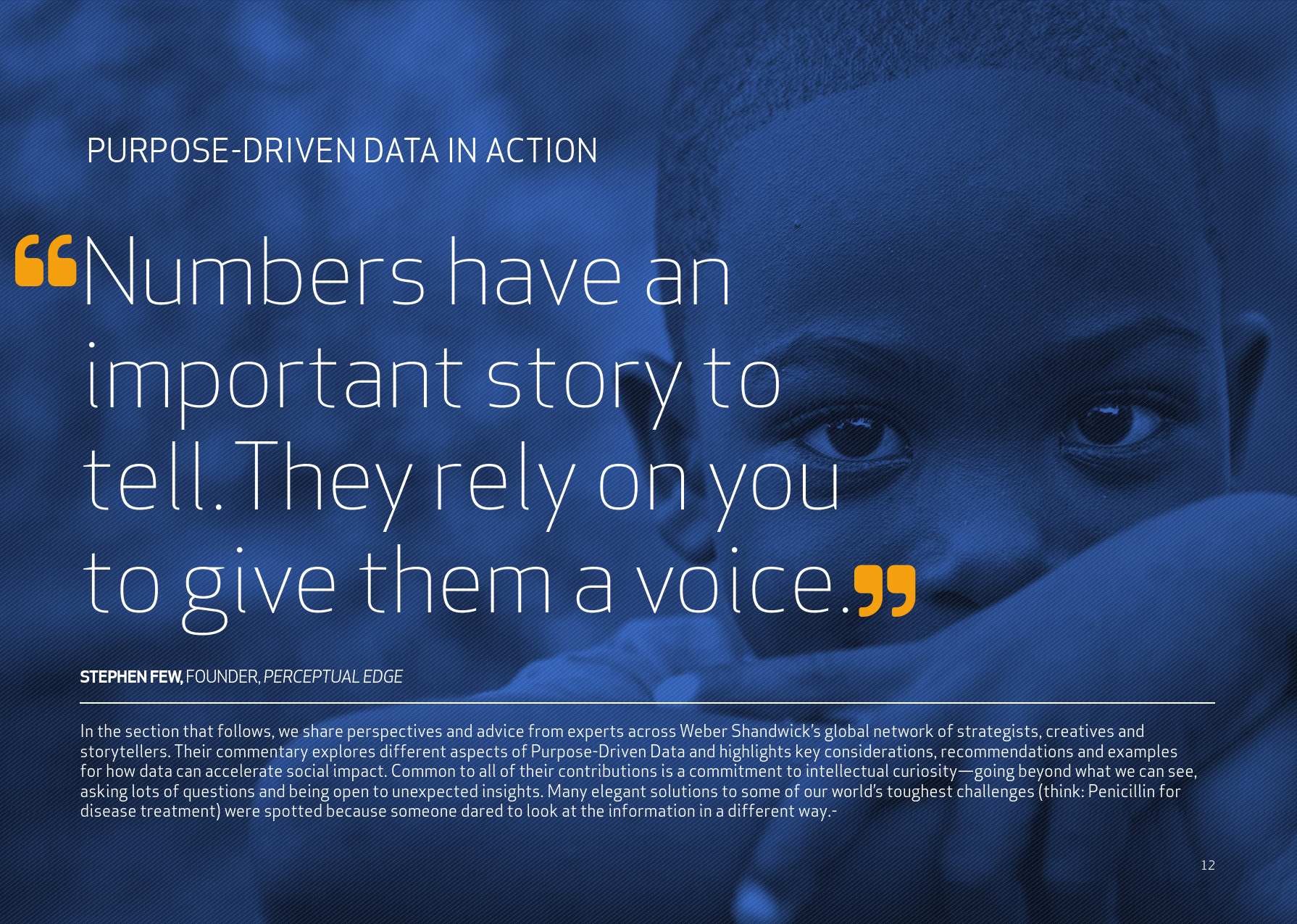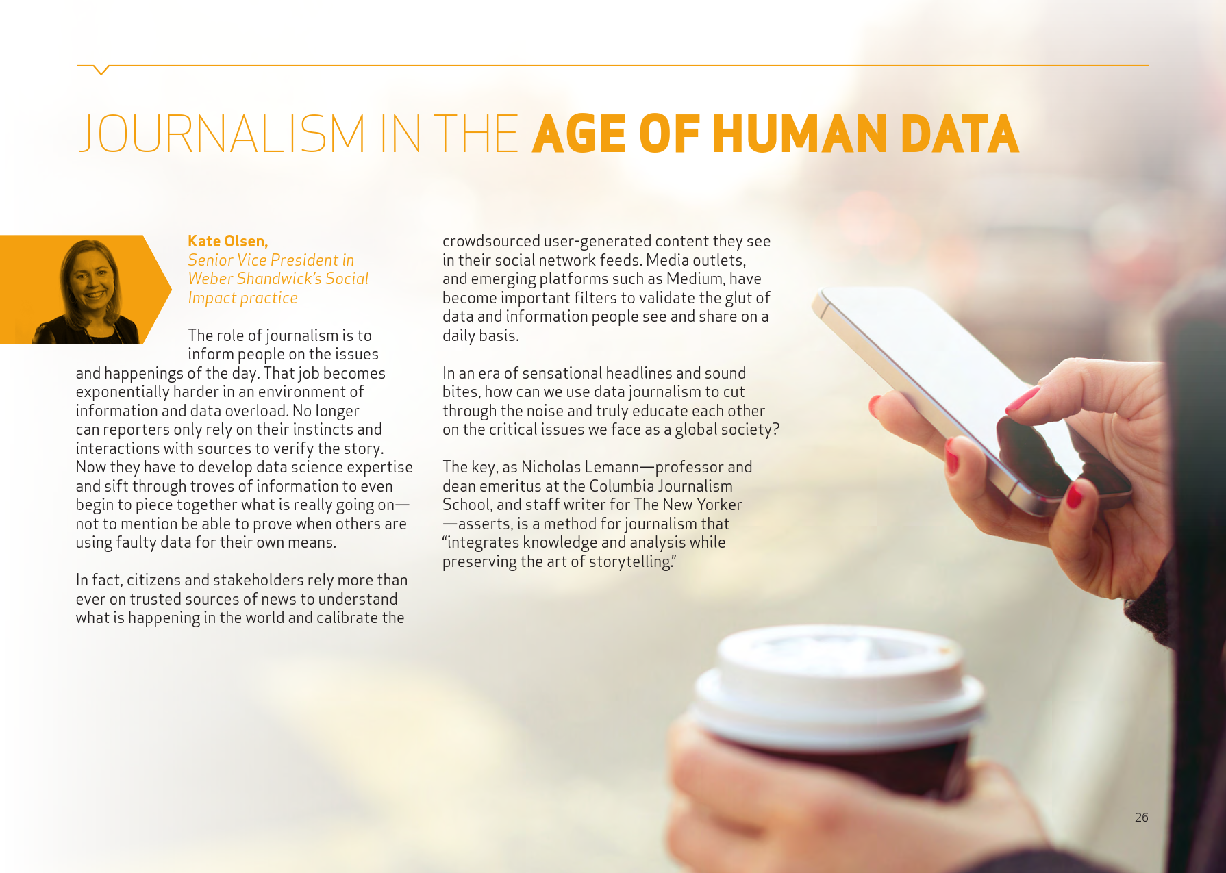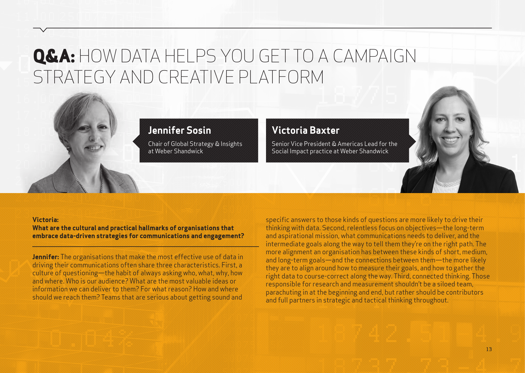 《目标驱动的数据》报告提出了“影响工程师”的概念,这些专业人士能够深入理解企业社会责任影响、国际发展与可持续性实践和趋势,能够将数据科学知识与传播有机结合在一起。该报告还展示了对万博宣伟若干专家进行的深度采访,其中包括一些企业社会责任专家,他们介绍了关于目标驱动数据相关话题的观点,同时强调了人类独创性对解读和赋予数据意义用以服务推动社会化以及环境发展进程所起的重要作用。
