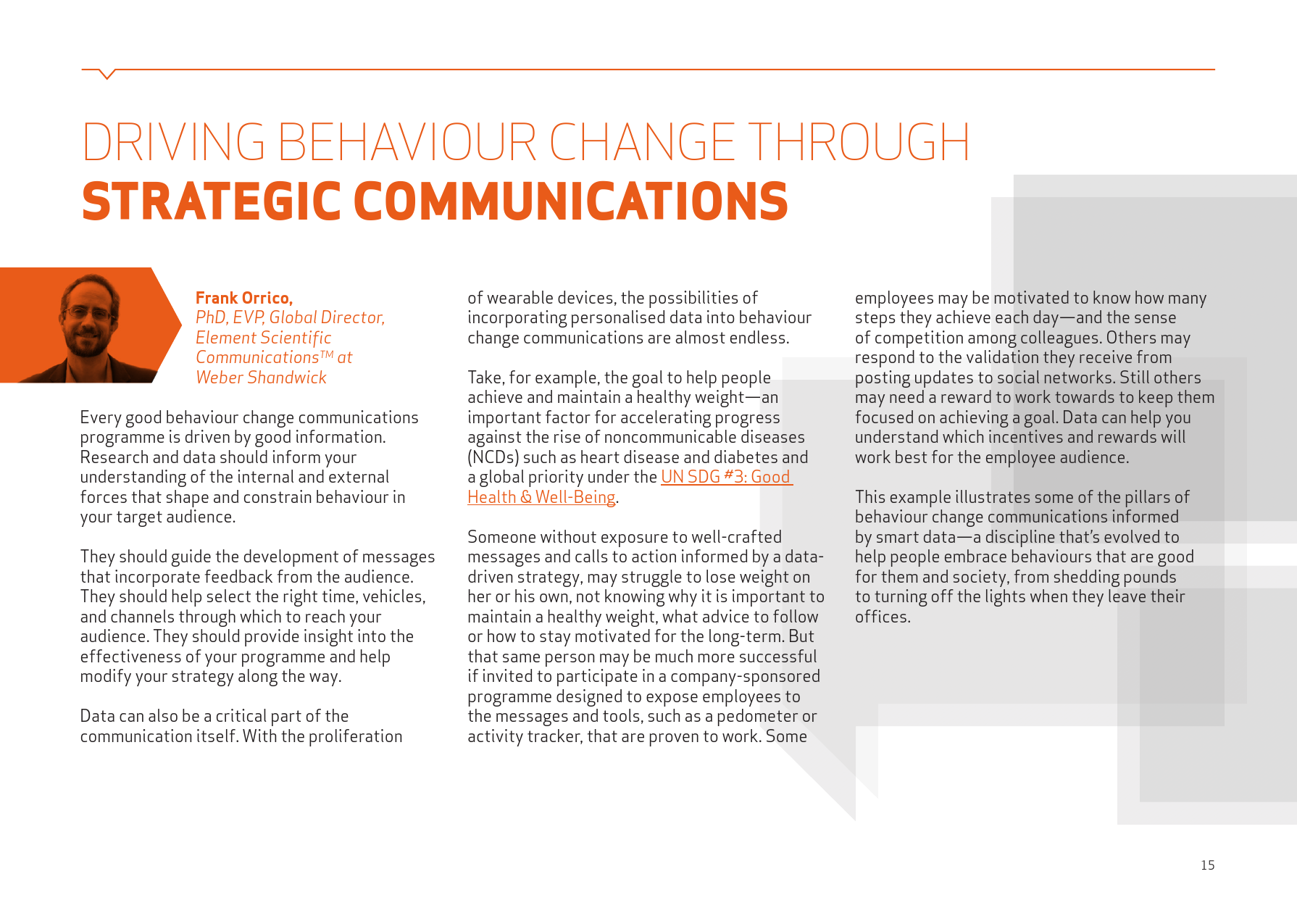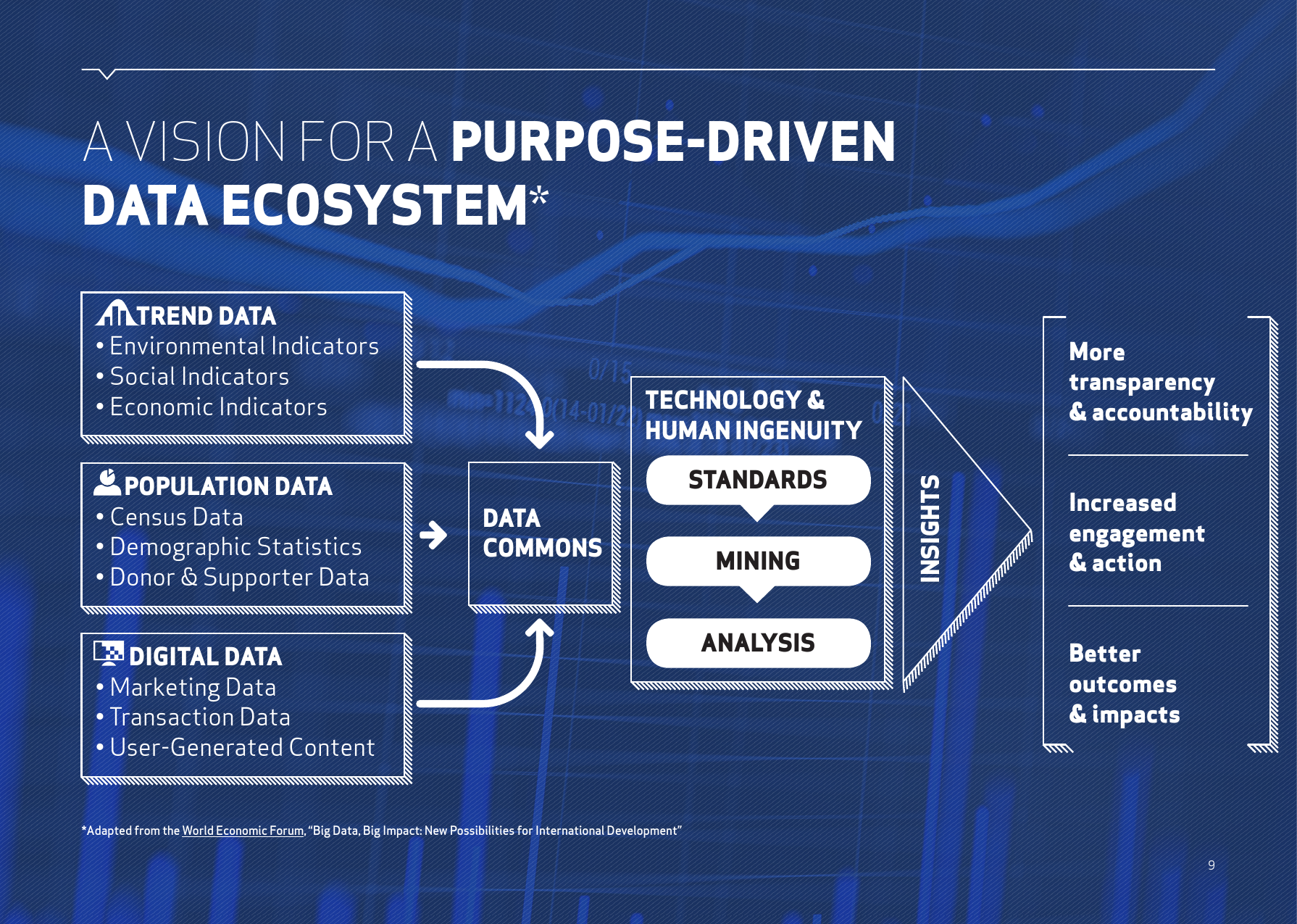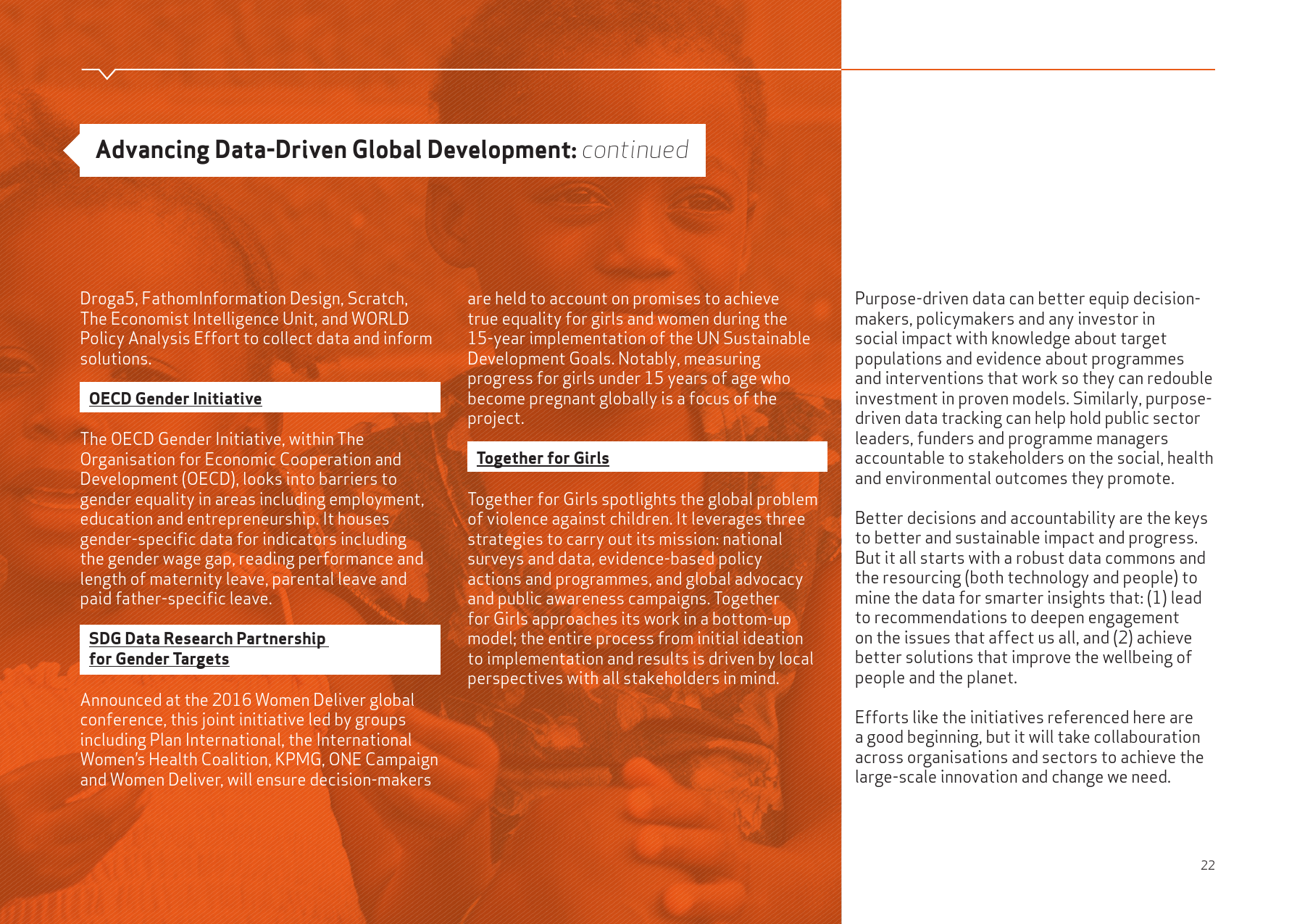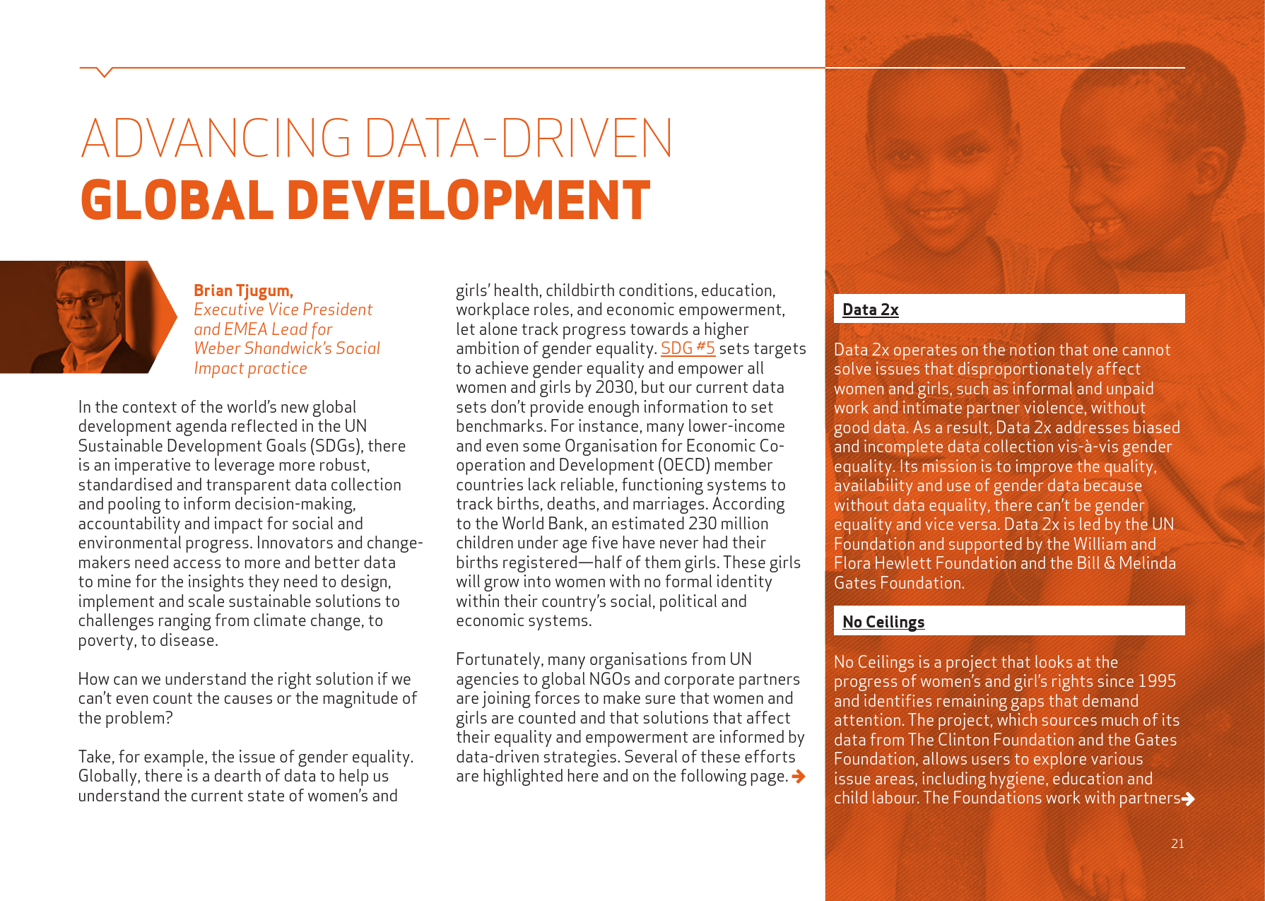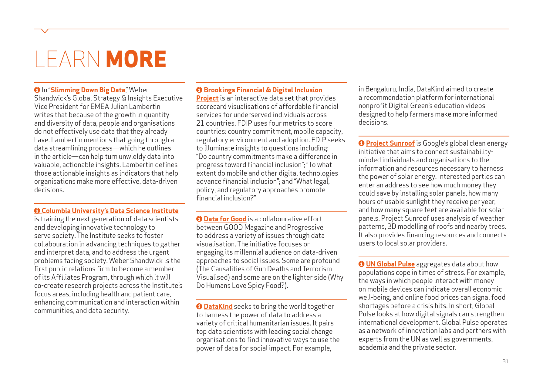 《目标驱动的数据》报告提出了“影响工程师”的概念,这些专业人士能够深入理解企业社会责任影响、国际发展与可持续性实践和趋势,能够将数据科学知识与传播有机结合在一起。该报告还展示了对万博宣伟若干专家进行的深度采访,其中包括一些企业社会责任专家,他们介绍了关于目标驱动数据相关话题的观点,同时强调了人类独创性对解读和赋予数据意义用以服务推动社会化以及环境发展进程所起的重要作用。