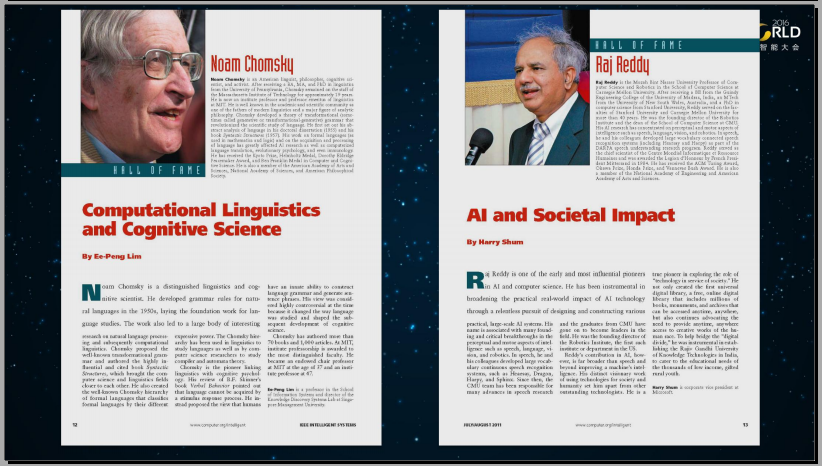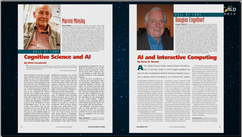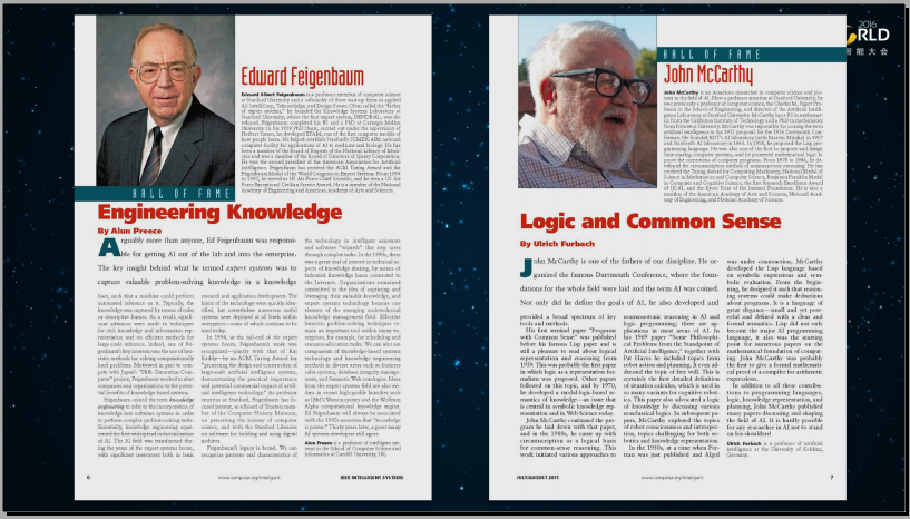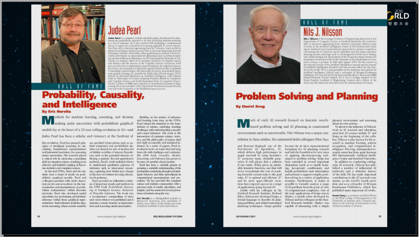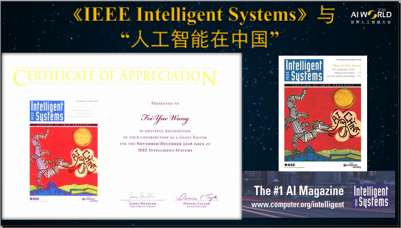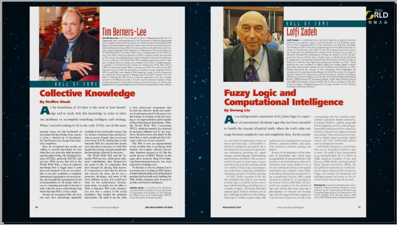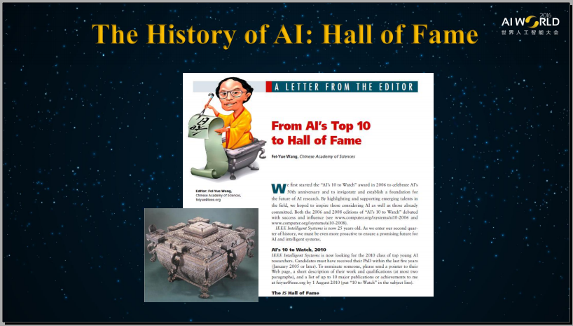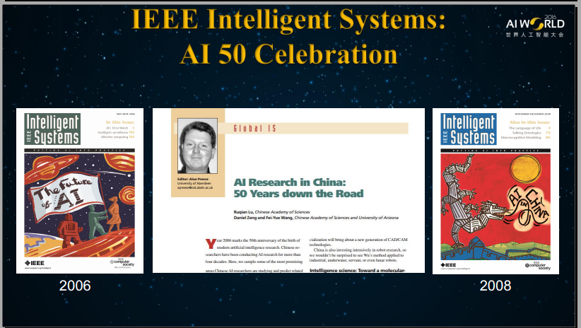 人工智能第一届名人堂成员是在五年前选出来的,我们最近刚刚选完的是第二届。十年之前,也就是2006年,当时的人工智能绝对没有今天这么热,时任人工智能国际杂志《IEEE Intelligent Systems》主编的James Hendler,为纪念人工智能50周年,出了一期专刊,叫做“The Future of AI”,后来快成刊了才发现,里面一篇中国的文章都没有。临出刊的最后一刻,我说人工智能50年,也不能没有中国的声音,便约了国内的陆汝钤院士,当时Arizona大学人工智能实验室的曾大军,再加上我,写了第一篇关于中国人工智能发展现状的文章,“AI Research in China: 50 Years Down the Road”。后来,我们想,应该给中国人工智能专门出一期专刊,所以08年又出了人工智能的一期专刊,叫做“AI in China”。