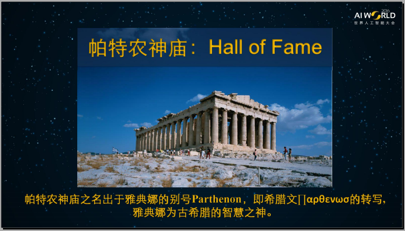 我们都知道,帕特农神庙是雅典娜女神的最大神殿,距今已有两千余年的历史,这也是世界上最早的“名人堂”之一了。雅典娜是古希腊的智慧之神,象征着人类对于智慧的向往。今天如此盛会,也是因为大家对于AI的追求,而共聚一堂。