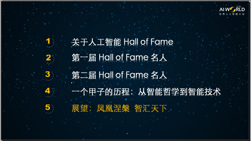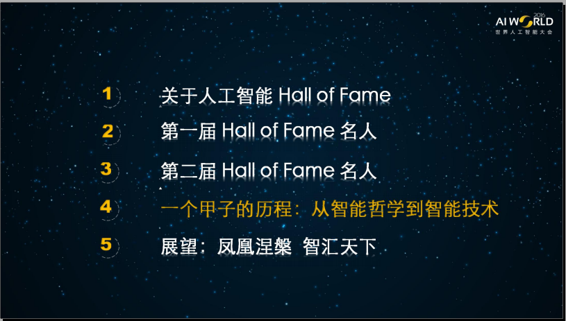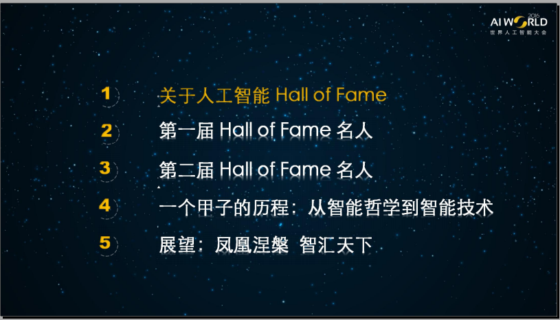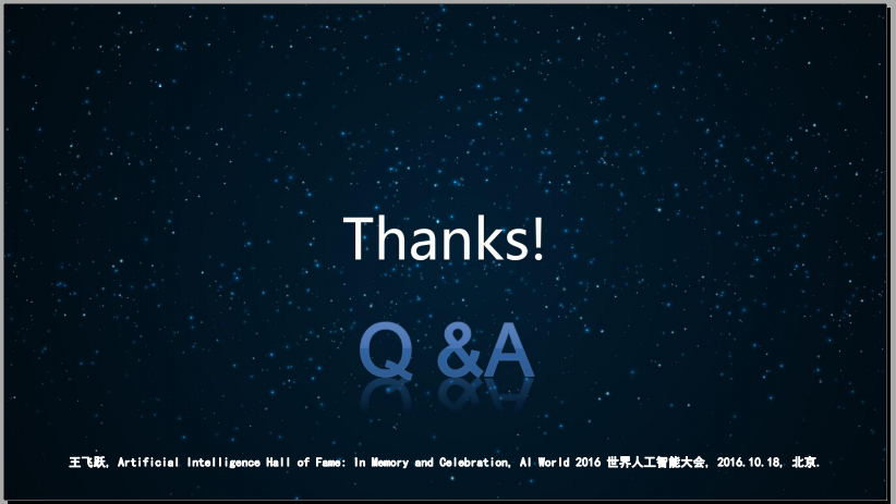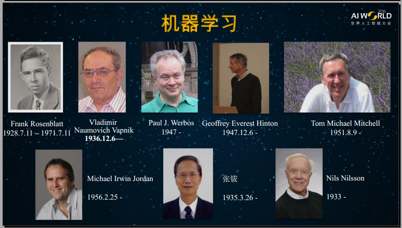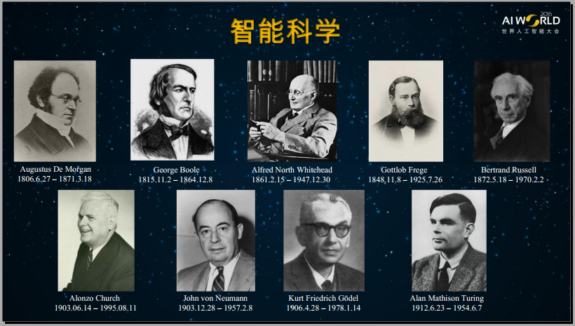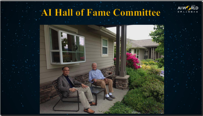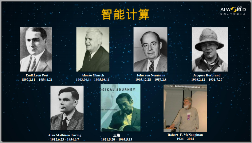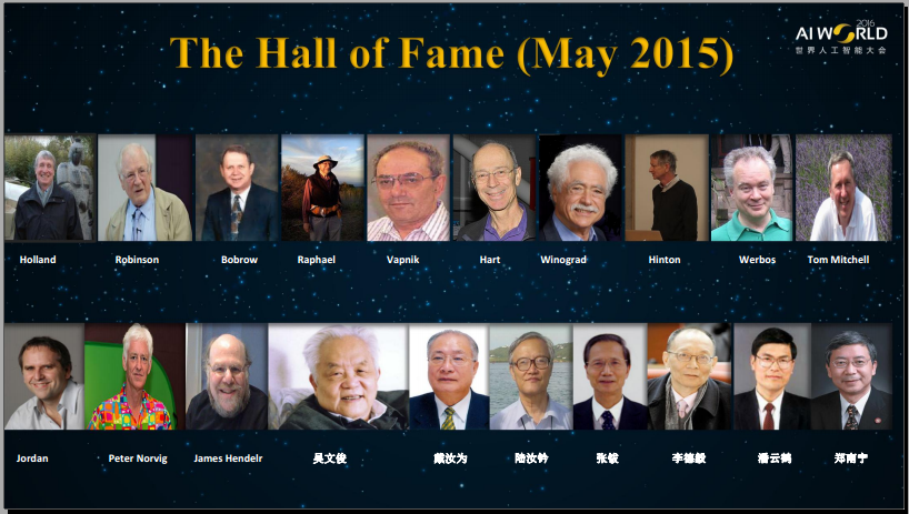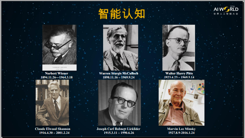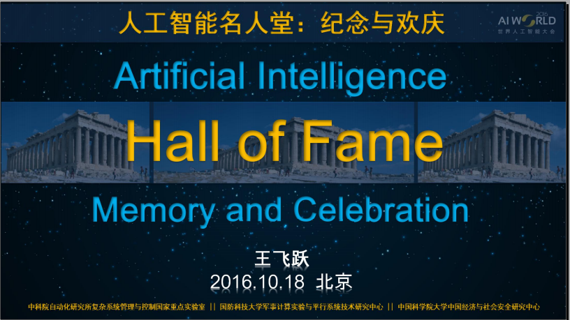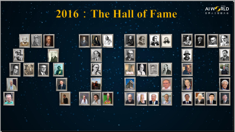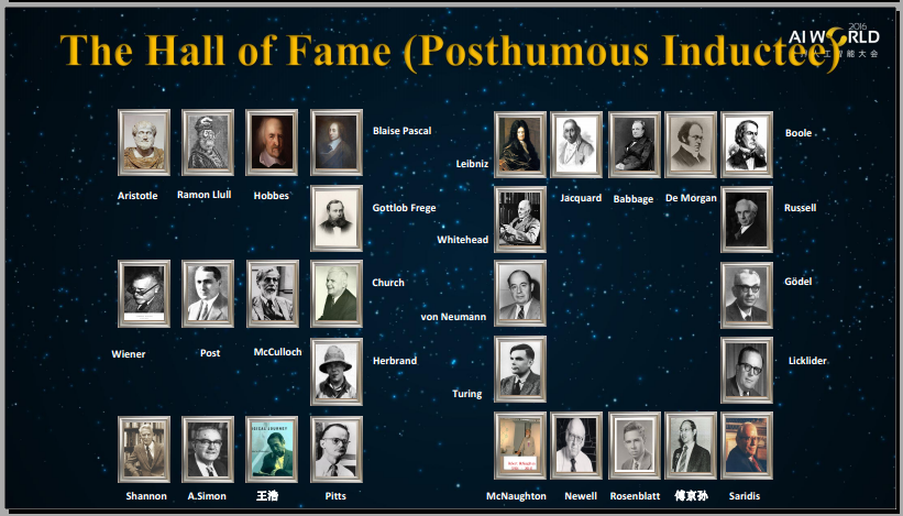 很高兴在中国自动化学会与新智元共同举办的“AI WORLD2016 世界人工智能大会”上与大家进行分享。我们知道,只有站在巨人的肩膀上,才能够看的更远。丘吉尔也曾说过,“The longer you can look back, the farther you can look forward. (回顾历史越久远,展望未来就越深远)”。今天我不讲科技,讲“AI Hall of Fame: In Memory and Celebration(人工智能名人堂:纪念与欢庆)”,希望同大家一起来回忆历史,共同回顾奠定了今天“智能”之发展的巨人们,以此纪念为人工智能做出杰出贡献的先辈与开拓者。