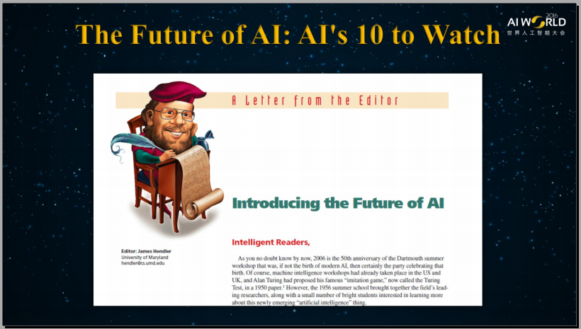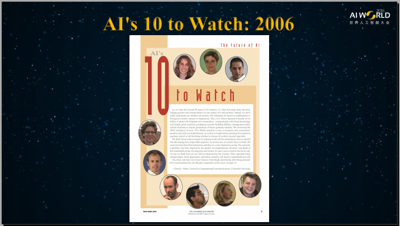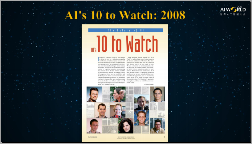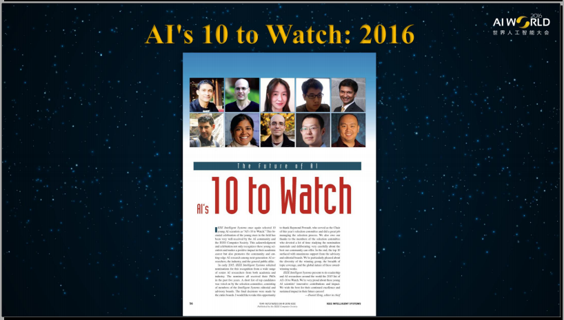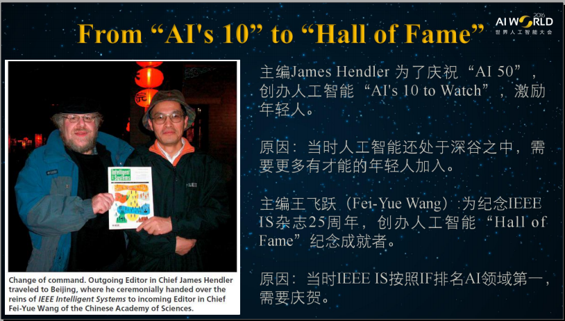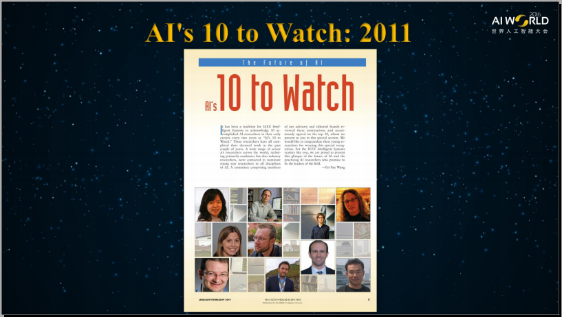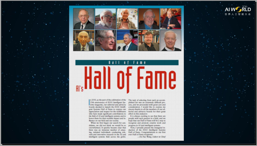 十年前,人工智能正处于低度深谷的时候,为了鼓励年轻人加入这个领域,我和James商量,选择一些在人工智能领域做研究的优秀年轻工作者,在我们的杂志(IEEE IS)上开一个专栏,进行介绍,以后再看看他们怎么发展。最开始专栏想用AI Top 10这个名字,后来觉得Top有些不太合适,改为了AI’s 10 to Watch。到2011年,我当杂志(IEEE IS)主编的第三年,正是我们的杂志创办25周年,大家说庆祝一下。其实最开始,我们杂志的名字是《IEEE Expert Systems》,后来从专家系统改为了智能系统,主要关注于应用人工智能。2011年我们的杂志在所有人工智能期刊杂志里面影响因子排名是最高的,也要庆祝一下。但我们不仅要看人工智能的未来,还要了解历史,于是便创办了人工智能“Hall of Fame”,纪念这个领域的成就者们。