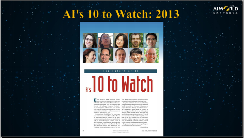 AI’s 10 To Watch 是从06年开始办,11年是第三期,当年有两位中国人当选,其中一个是北大的王立威;2013年公布的是第4届,有三位中国人当选,其中一位是清华的朱军,最近的(2016年)这一届也有三名华人,其中包括大陆清华毕业的夏立荣,现在在RPI做教授。这是10年来五届名人堂的情况。