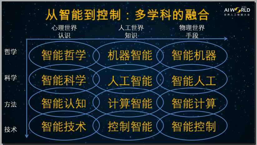 六十年,是一个甲子的路程。但是智能从亚里士多德三段式行事逻辑一直到今天,其发展的整个历程,大体可以分几块。它起源于哲学,哲学的原意就是爱智慧,人工智能跟哲学连起来这是自然而然的,我们整个现代科学也是在哲学基础上发展而来的。然后经过Leibniz、Boole(布尔代数)、Frege逐渐把逻辑形式化发展为数理逻辑,再经过Whitehead,Russell,Godel,Church,Turing等发展为智能科学的基础,再经过Wiener,McCulloch,Pitts,Shannon开启了认知科学的领域。哲学—科学—认知这是在我们的心理世界,要转化成知识就变成机器智能、人工智能、计算智能,最终变成改造物理世界的手段。我们需要的是智能机器、智能人工、智能代理、智能计算,最后就是智能控制。