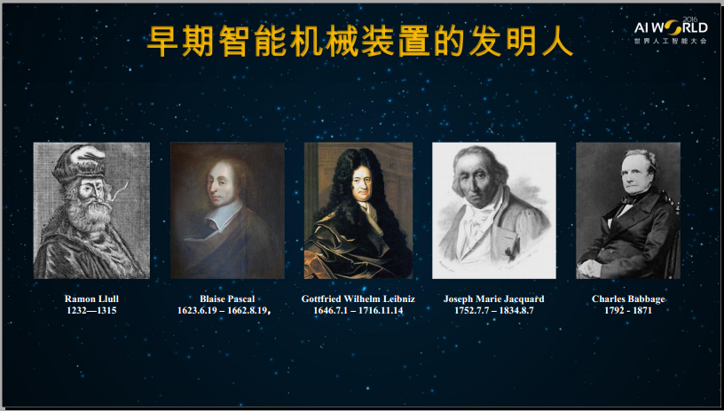 早期智能机械装置的发明人: 最早试着用机械装置做逻辑与计算的人是Llull。他做的第一代“图灵机”,凭脑袋勾画了三个圈,后人认为,这是最早的图灵机原型,他是第一个提出虚拟计算机的人。其他几位大家都很了解了。