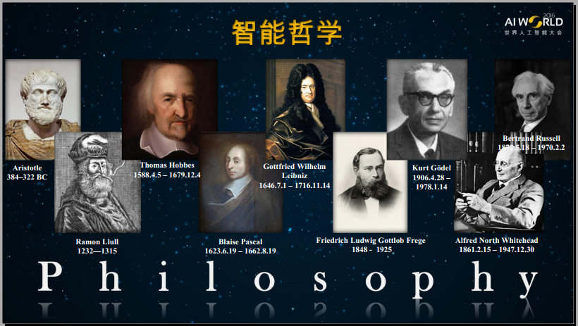 Pascal,大家都知道,第一个做现代意义下计算机原型的人,他也是一个哲学家。二进制的提出者,莱布尼茨,他还提出了逻辑推理器的原型,包括后来的波尔代数跟他的工作全是串在一起的。对我来说,影响非常大的还有Whitehead提出的《过程哲学》,是哲学里的创新,更是人工智能创新的基础。他与学生Russell写了《数学原理》这本书,三大卷,实实在在地催生了人工智能。