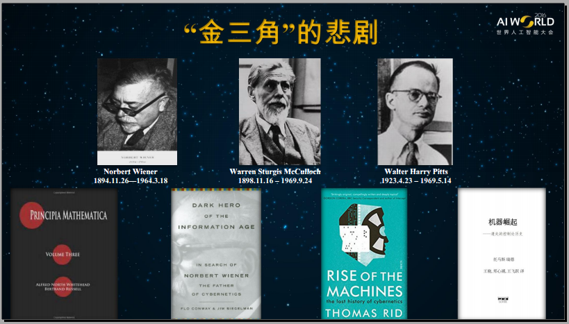 “金三角”的悲剧:上世纪40年代和50年代初,在美国学界你不知道这三个人(Wiener, McCulloch, Pitts)你就OUT了,这三个人当年是领导了全世界最先进的认知科学研究,一起提出了Cybernetics、神经元网络;今天的大脑研究,就是这么来的。这三个人都是同时受一本书的影响,就是《数学原理》这本书。最初Wiener准备读生物学,后来转为了数学,又转哲学,就是受这本书影响;McCulloch大学是读心理学的,读了这本书,认为大脑就是应该想这本书说的一样工作,就去研究大脑去了,后来画出了第一个大脑功能图,成立了世界第一个大脑实验研究室。Pitts,就更传奇了,他被父亲打得没地方躲,躲到图书馆去,在图书馆的时候撞到了一本大部头的书,就是《数学原理》,无师自通一个星期读下来,还写了厚厚的笔记寄给罗素(Russell)。罗素原本认为世界上只有五个人通读过《数学原理》,发现这个人很有心得,十分高兴,就邀请他到剑桥做研究生,却不知道他是一个连中学还没毕业的小孩,根本没钱到剑桥去。后来罗素到芝加哥讲课,Pitts离家出走到芝加哥找罗素,从此再没回家过。在芝加哥遇到McCulloch,志趣相投加上没钱,就住到McCulloch家去了,晚上聊天,就聊出了McCulloch-Pitts神经元网络模型,今天的神经元网络就是这么来的,这也就是今天的深度学习怎么来的。后来这三个人走到一起,成了非常好的朋友。维纳利用自己的影响,说通了MIT录取连初中文凭都没有的Pitts到MIT做他的博士生,后来McCulloch也放弃教授的位置,甘愿到MIT做一个实验室研究人员,就是为了同维纳一起进行研究。当时,维纳是他们的精神领袖,几乎有“神”一样的权威。那时,香农还是个刚毕业的青年人,参加军方工作,经常回MIT向维纳讨教,还把维纳关于信息的正熵写成负熵,最后维纳拒绝见他,因为香农是来挖他”脑浆”的。这也是后来John McCarthy找香农开首届人工智能会议的因素之一。