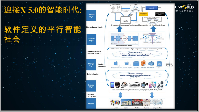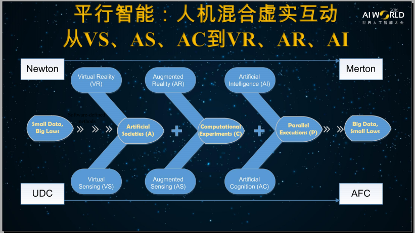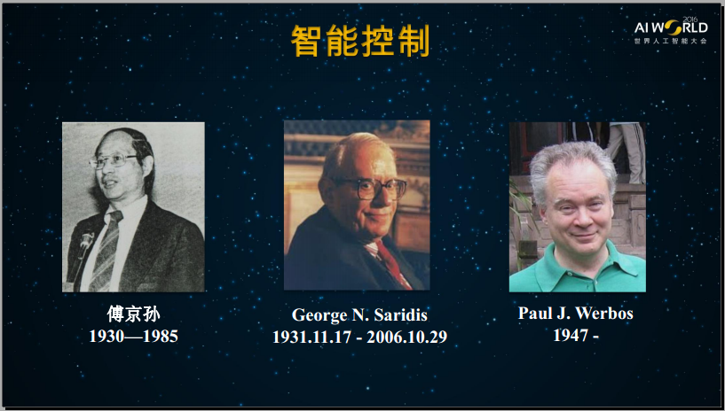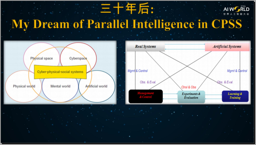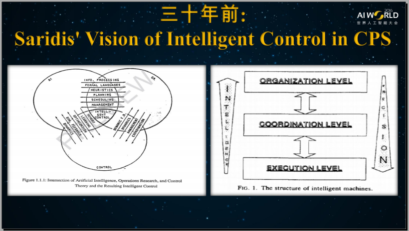 人工智能真正作用到世界,要借助智能控制。傅京孙(K. S. Fu,IEEE PAMI的创始人)和Saridis(IEEE 机器人与自动化学会和智能控制委员会的创立者)就是智能控制的提出者。当年Saridis曾给我画了三个圈,人工智能+运筹学+CS(控制系统、通讯系统、计算机系统);三个框,组织、协调、执行。30年后,我画了平行智能的五个圈、五个框,从CPS到CPSS,从牛顿到默顿,从UDC到AFC。