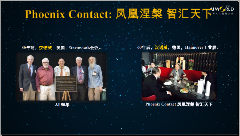 60年前,人工智能在美国的汉诺威正式诞生。在中国,60周年是一个甲子,一切重新来过。今年,我在另外一个汉诺威,在德国的汉诺威,见到了PhoenixContact公司的两位总裁,他们正想进军工业4.0和智能产业。我跟对方说,他们公司的名字很好,Phoenix Contact 中文的意思就是“凤凰涅槃,智汇天下”,做智能产业是天时。