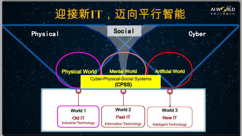 人工智能是很多人努力的结果,人工智能有一段很长的历史。大家在这个历史时刻应该回头看一下。AlphaGO预示着我们进入新的IT时代,IT不再是过去的信息技术,也不是老的工业技术,而是新的智能技术,我们开发的是第三个世界,人工世界,这个世界需要新IT,但是不能忘了物理世界的老IT,不能忘了心理世界的旧IT。今天之IT代表了老、新、旧的三种组合。人工智能要从牛顿时代跳到默顿时代,今天这个会如此成功就是默顿时代的有力证明。我们相信软件定义的一切将成为未来社会最重要的实力。