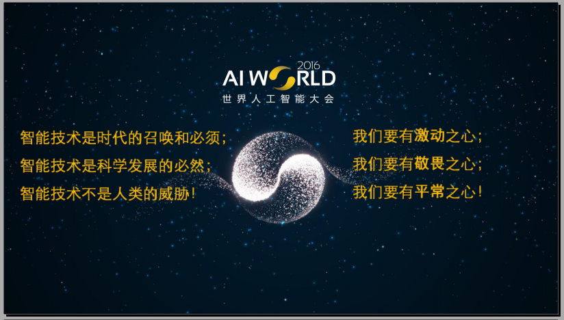 大家对人工智能要有激动之心,因为这是时代的召唤;要有敬畏之心,毕竟这么多科学家奋斗了这么多年才有了今天的热潮。我个人不相信人工智能是对人类的威胁,霍金说人工智能预示着人类的终结,我套用他的一句话进行回应,他说“我们不能把飞机失事归罪于万有引力”,那我们也不能把人类的灭亡归罪到人工智能身上。对此,大家要怀有平常之心。