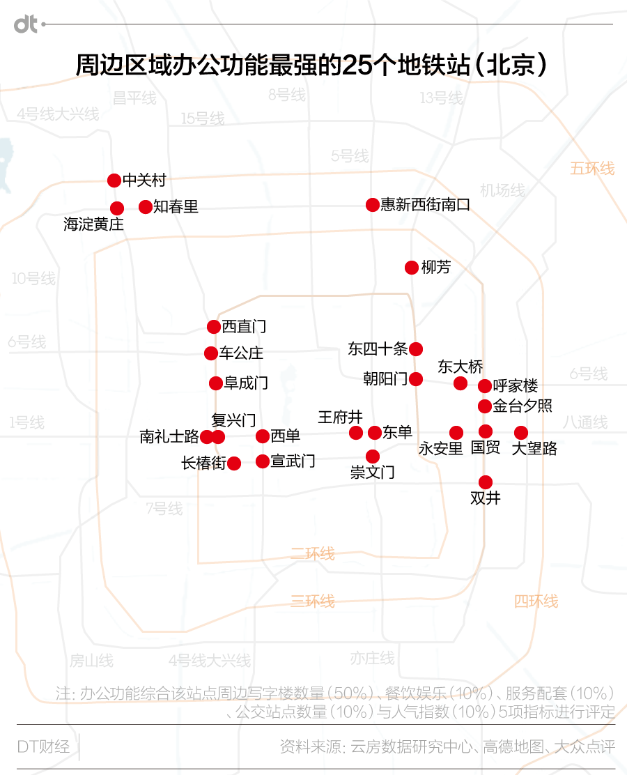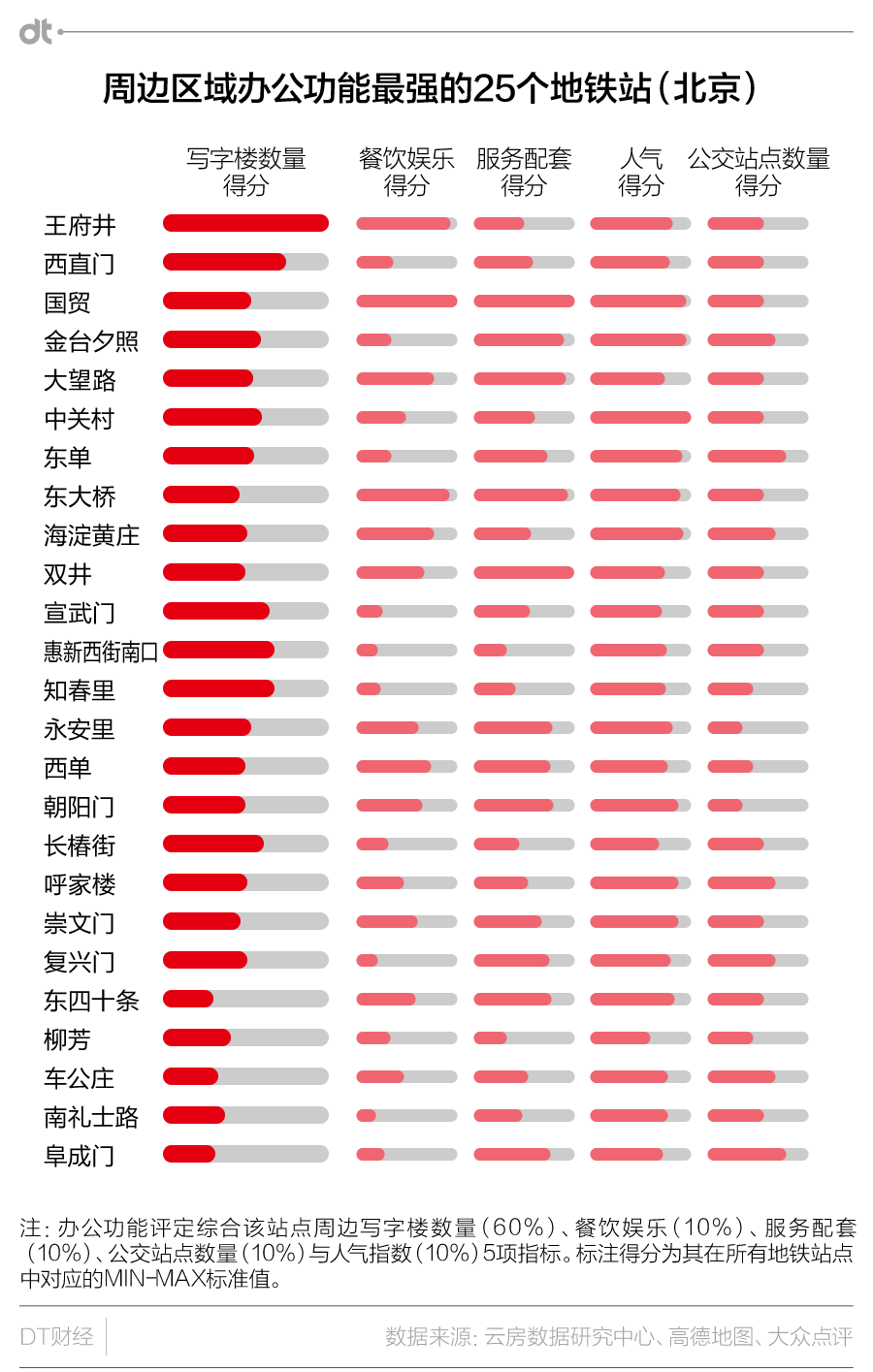 DT君综合考察了地铁站点周边的写字楼数量、餐饮娱乐配套数量、服务配套数量、人气指数以及公交站点数量这5项指标,对北京278个“地铁1公里”的办公功能进行评定。