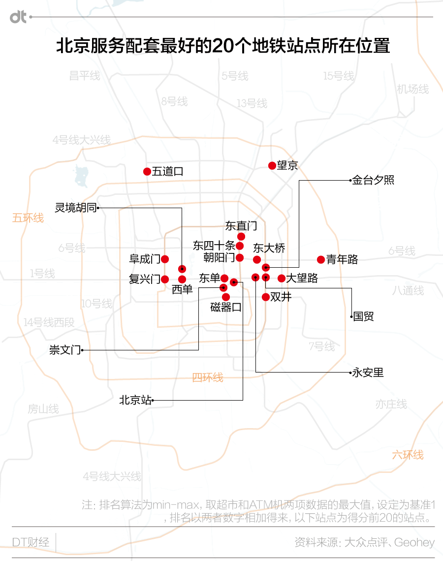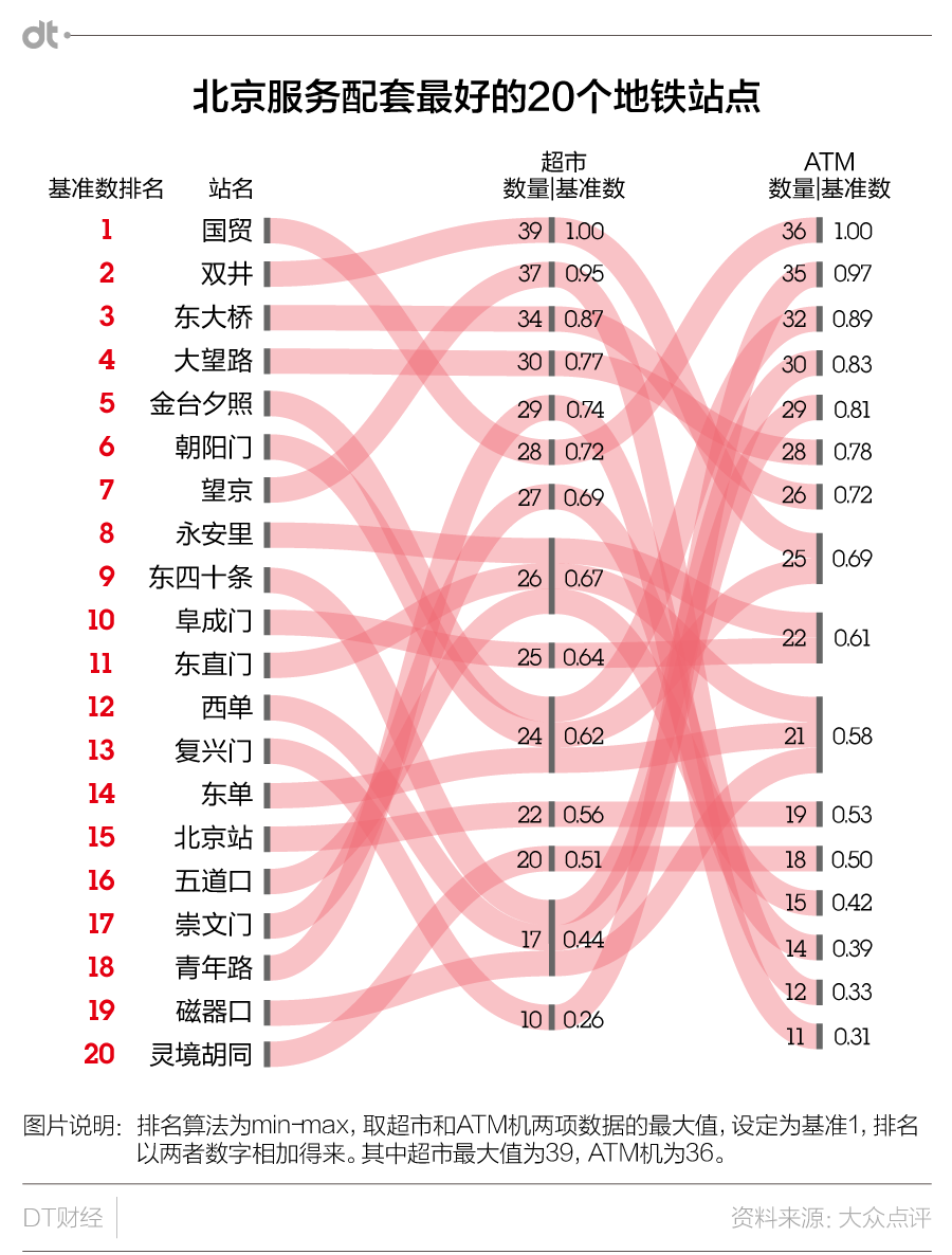 我们通过综合考量地铁站周边的超市数量与银行ATM的数量,为其服务配套成熟度打了个分。