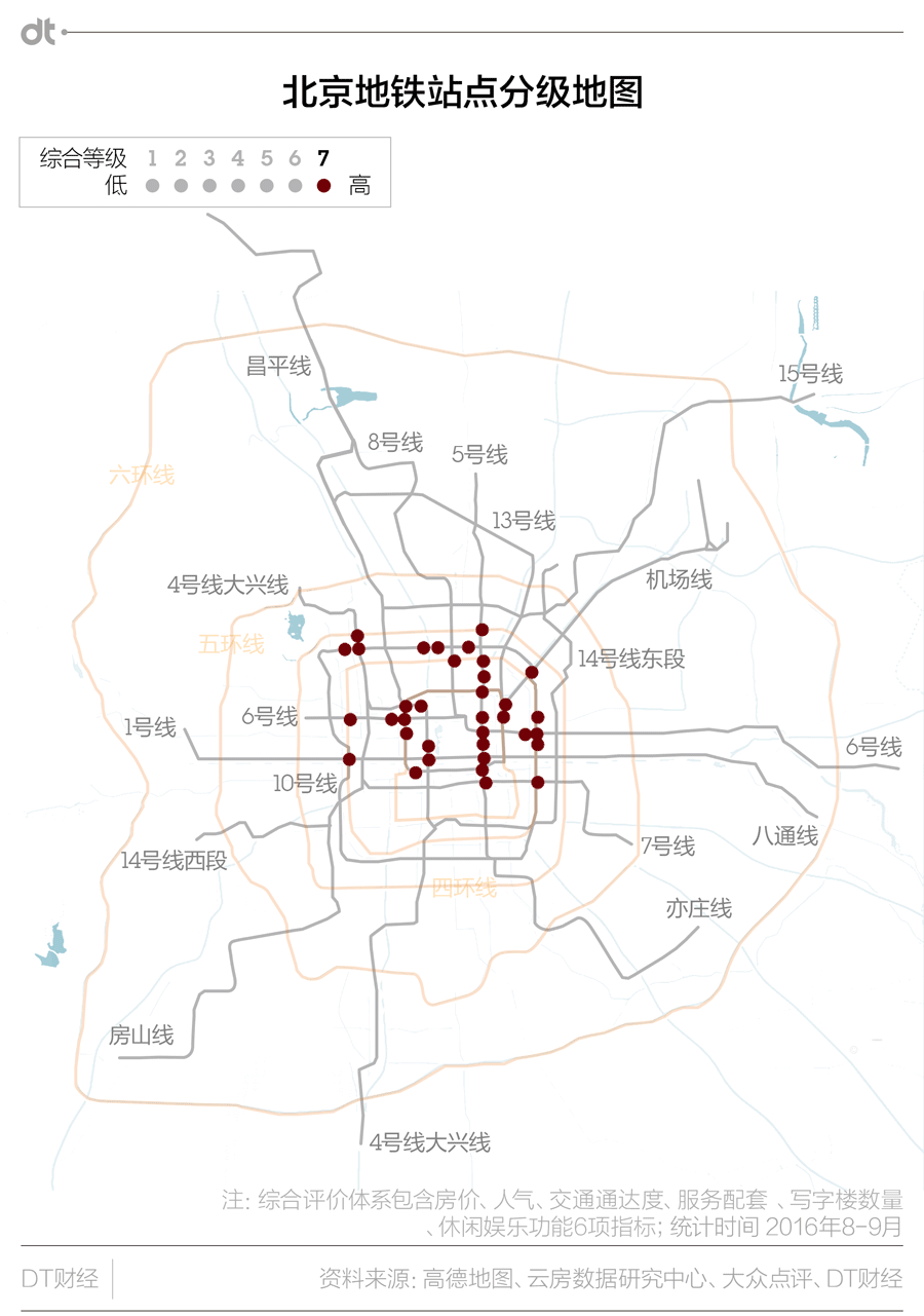 通过综合评价体系,我们把地铁站周边的对应评价指标(房价、人气、交通通达度、服务配套、餐饮娱乐功能、写字楼数量)分门别类进行了排名,每一项能挤进前100名的就算表现不错;一个地铁站点,表现不错的指标数量越多,等级就越高。
