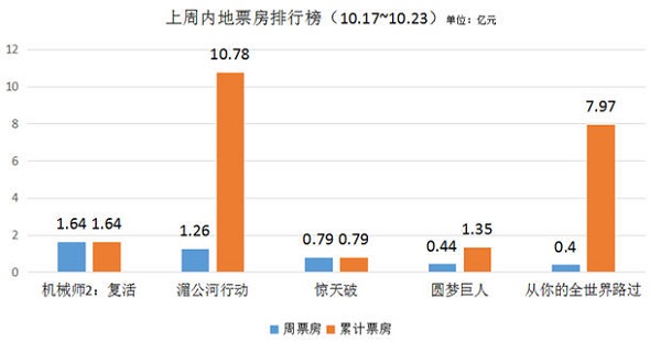 单片方面,杰森·斯坦森主演的《机械师2:复活》表现亮眼,首周三天票房1.64亿,轻松拿下周票房冠军。《湄公河行动》、《圆梦巨人》、《从你的全世界路过》三部老片都守住了周票房前五的位置,其中《湄公河行动》票房破10亿,《从你的全世界路过》也成功超越《北京遇上西雅图之不二情书》,刷新国产爱情片票房纪录。