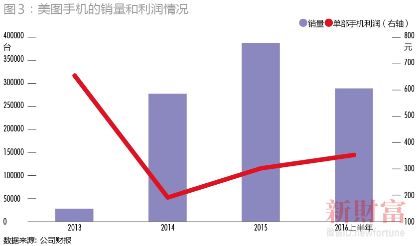 正因为如此,美图手机一推出,便受到了年轻女性的热捧。招股书显示,美图手机于2013年、2014年、2015年、2016年上半年分别售出手机约27917台、277595台、387775台及289079台(图3)。从销售数据可看出,2014年,美图手机的销量较2013年增长了近10倍,2015年和2016年的销量也稳步提升。