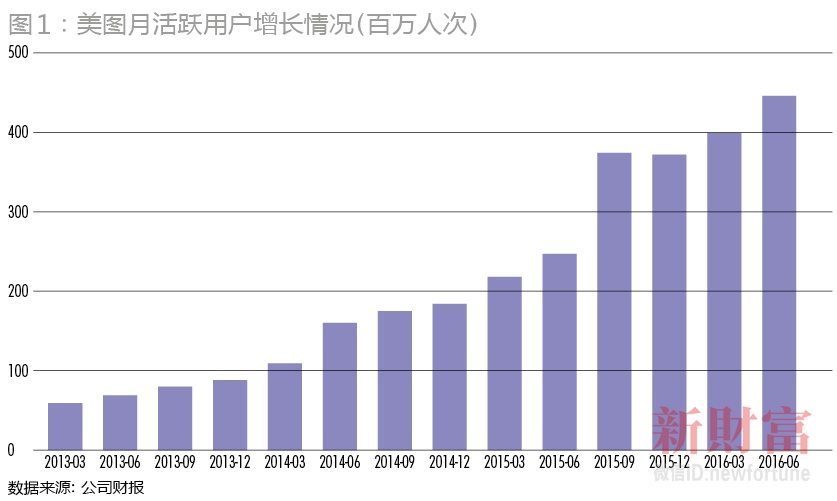 美图招股书最大的亮点在于,2016年6月,美图应用的月活跃用户数约为4.46亿人,同比增长81.0%(图1)。而腾讯控股公布的中期业绩显示,微信每月活跃用户升至超过8亿户。