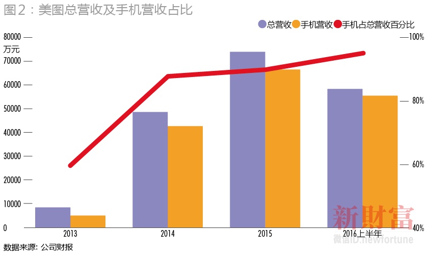 围绕“变美”这一核心,在智能手机火爆的市场背景下,美图公司还推出了首款“主打自拍”的智能手机。虽然在美图创始人蔡文胜看来,做手机只是“玩票”,“是美图软件的配套”,但招股说明书却显示,2016年上半年,美图智能手机的销售收入占总收入的95%以上。