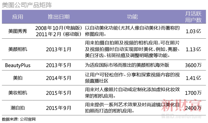 以“美图秀秀”起家,美图公司围绕“美颜”打造了一个自拍产品矩阵(附表)。六款核心影像应用,“美图秀秀”、美颜相机、BeautyPlus、潮自拍、美妆相机以及视频与直播社区应用“美拍”, 常年占据着应用商店免费影像与视频应用的榜首。据艾瑞咨询统计,2016年6月,中国约有95.3%的影像应用用户将至少一款美图应用列入其最喜爱的三款影像应用之一,而中国约62.4%的短视频平台用户将“美拍”列入其最喜爱的三款短视频平台之一。