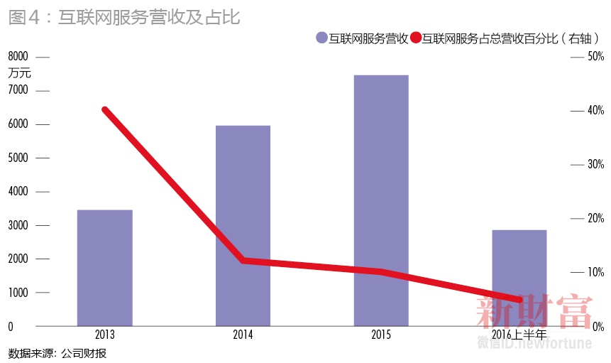 除了手机销售外,美图公司的另一收入来源是以在线广告为主的互联网服务。2013年以来,尽管这部分收入也在持续攀升,但不管是与智能硬件的贡献相比,还是与高达上亿的月活跃用户相比,美图公司在工具应用上的营收几乎都是“少得可怜”(图4)。也就是说,即便拥有美图秀秀、美颜相机、美拍等爆款影像应用,美图还未真正激活几大影像应用积累的用户价值。