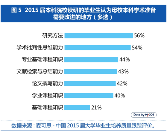 2015届本科毕业生读研的人群认为母校本科学术准备最需要改进的地方是“研究方法”(56%),其后是“学术批判性思维能力”(54%)、“专业基础课程知识”(44%)等。