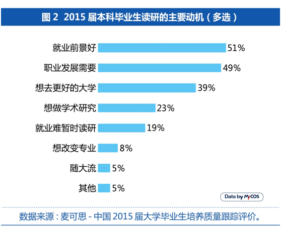 研究显示,2015届本科毕业生读研的主要动机是“就业前景好”(51%)和“职业发展需要”(49%)。可见面对就业压力,以高学历增强自身就业竞争力是大多数读研本科毕业生的选择。另外值得注意的是,读研本科毕业生中有5%是因为“随大流”。