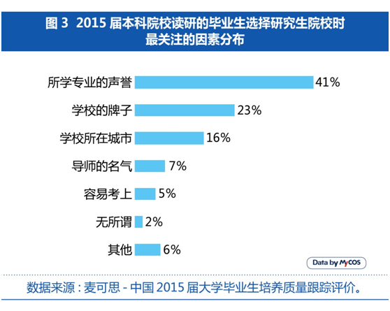 麦可思以2015届及2012届本科毕业生为分析样本,数据显示,选择读研的女生比例比男生高3.3%,医学专业读研比例最高,管理学最低;27%的本科生选择跨专业考研,增强就业竞争力是读研主因;在学校和专业中,本科生读研择校更关注“所学专业的声誉”。