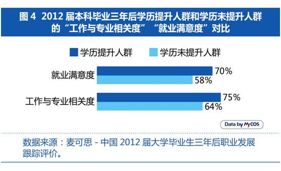 尽管三年后的薪资优势不明显,但学历提升人群在“就业满意度”及“工作与专业相关度”方面分别高出学历未提升人群12个、11个百分点。这或许说明学历提升更有助于实现其就业的主观预期。