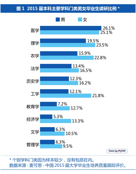 数据显示,选择读研的女生比例为15.2%,比男生(11.9%)高出3.3个百分点。除了医学门类本科毕业生中,读研男生比例略高于女生(男:26.1%,女:25.1%),其他主要学科门类都是“女高男低”。