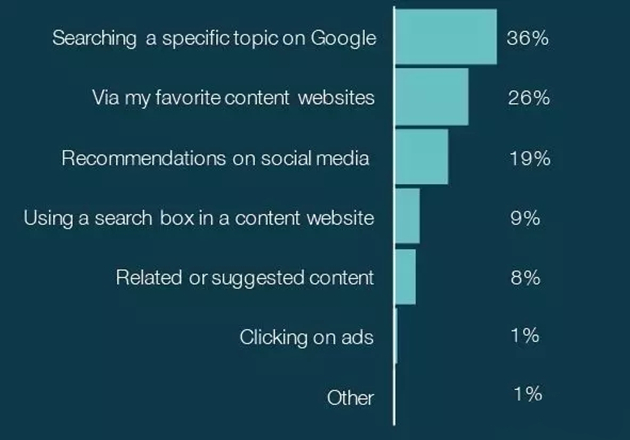 根据图1,研究中发现,用户在消费内容时最偏爱的是谷歌搜索渠道,比例高达36%,其次则是自己喜爱的网站,占26%。这对魁首的设定很有趣:“谷歌搜索”都有关键字,意味着用户已经有明确目标;“浏览最爱的网站”则是尚没有明确目标,仅在一个自己预先设定的偏爱范围内被动浏览。谷歌搜索渠道的大比例领先则说明了用户对主动搜索内容的偏爱。因此,喜欢通过社交网络推荐获来取内容的用户比例差不多只有第一名的一半,很有可能与主动控制程度不高有关。