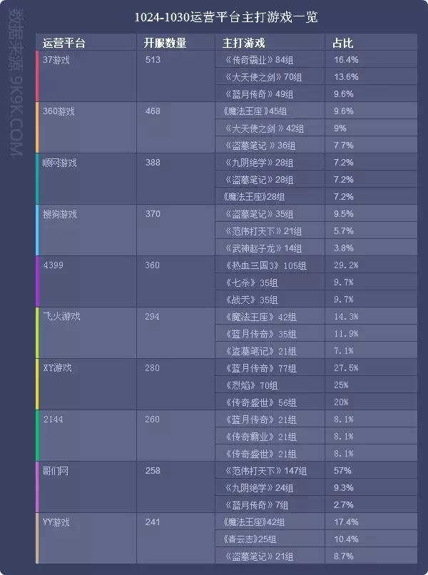 点评:本周榜单各平台游戏开服分布变化不大,其中顺网游戏《盗墓笔记》新晋为平台主打游戏,开服占比7.2%;而本周哥们网主打游戏《范伟打天下》的开服频率下调至21服/天,开服占比也稀释至57%,致哥们网开服总数较上周下降了9%。