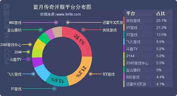 点评:本周《蓝月传奇》开服形势稳定,在各平台开服占比均为发生太大变化,新增分布占比平台金山猎豹、602游戏。