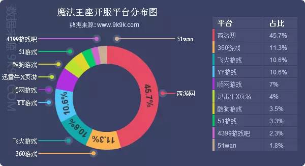 点评:《魔法王座》本周开服总数略有下降,其在西游网的开服被进一步稀释至45.7%,其余各平台分布占比变化不大;未有新增分布占比平台。