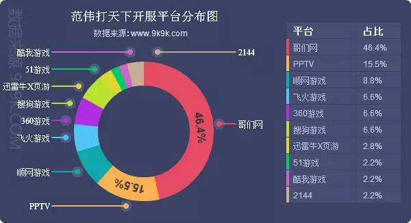 点评:《范伟打天下》本周开服数较上周有所下降,其在哥们网的开服频率下调至21服/天成为主因,其他各平台开服占比未发生太大波动;新增分布占比平台酷我游戏,2144。