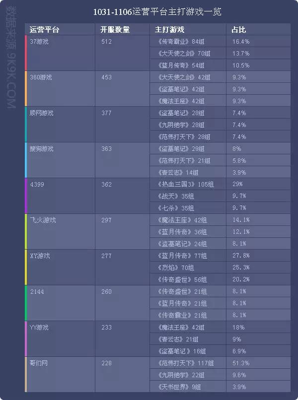 点评:《传奇霸业》本周开服继续保持稳定,各平台开服分布均无显著变化,未有新增分布占比平台。