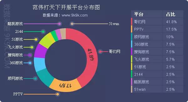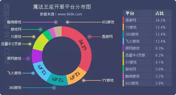 点评:本周《魔法王座》开服较上周减少11.9%,西游网下调了其开服频率为主因,其在西游网开服占比也相应减少11.5%。其余平台开服形势变化不大,新增分布占比平台游戏网、酷狗游戏、602游戏。