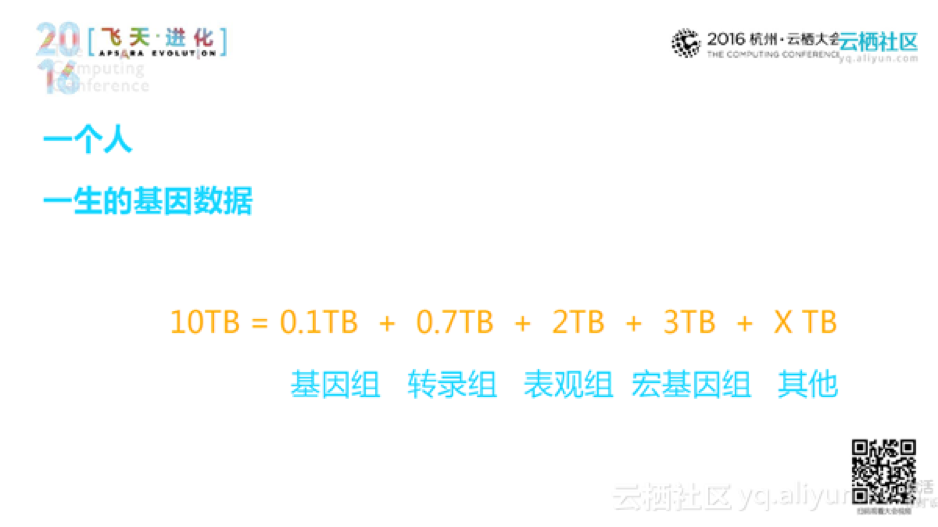 为什么基因数据的数据量非常大?从上图中可以看出,我们的基因数据不仅仅是来自细胞核中的基因组,其还包括转录组、表现组(比如肠道卫生基因组、表观基因组等)、宏基因组等。这些数据加起来大约会有10T的数量级。基因数据的分析过程包括:测序,即从化学信号转为数字信号;数据记录成相应的数据格式;解读、比对、数据分析,以此来知道这个人为什么会如此的不同?为什么容易患病?为什么能够千杯不倒?为什么代谢咖啡的速度会特别快?最终形成数据报告。