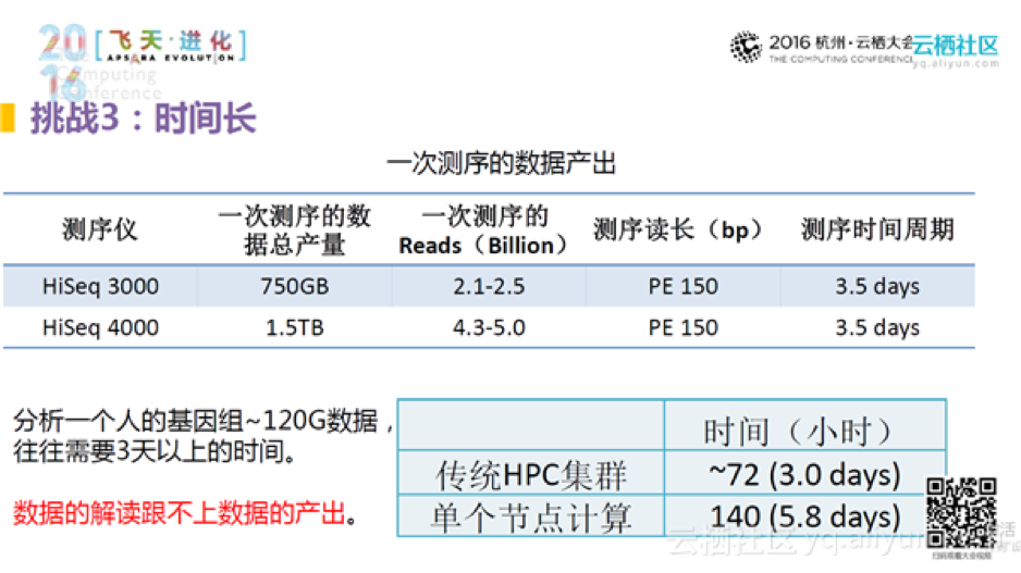 最致命的问题是分析时间过长。目前最先进的测序仪每一次测序的数据产量是1.5TB(大约为150人的数据量),并且产出这些数据的时间为3.5天。用传统的HPC集群进行分析的话,基本需要3天的时间来分析一个人的数据,而单个节点的话则需要5.8天的时间。由此可以看出,数据解读的效率远远跟不上数据的产出速度,这就为精准医疗后续的发展带来了极大的挑战。因为精准医疗就是要精准到个人的个性化用药,每个人的所有性状信息只有通过基因数据的分析才能做到个性化医疗。