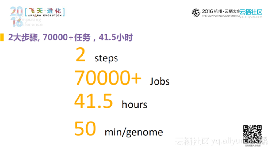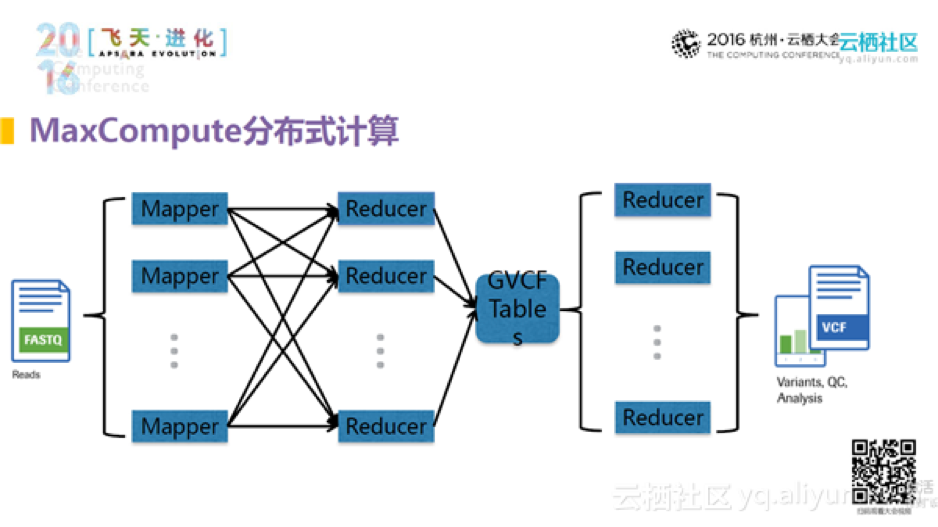 把最常用的基因组的解读放在了MaxCompute上部署,这个过程与单机部署的过程完全不一样。此过程需要把产出数据到得到最终结果的过程中的每一步利用MaxCompute的思维将其分散出去,然后把如何去并行、如何加快有效速度在过程中呈现出来。