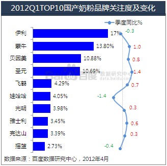 国产奶粉品牌关注度主要集中于伊利、蒙牛、贝因美和圣元,前四名关注度占比合计超过50%,第五名之后的品牌关注度占比均小于5%。