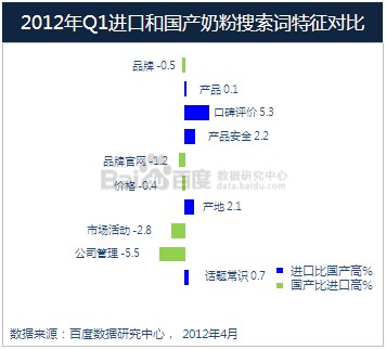 网民对进口奶粉口碑、安全和产地的关注度高于国产奶粉